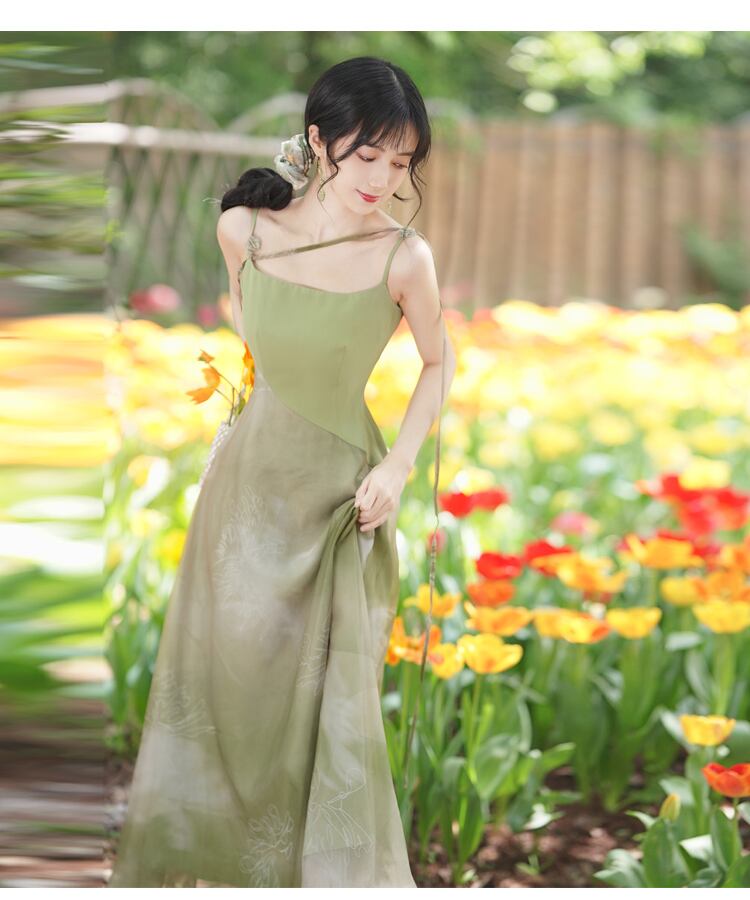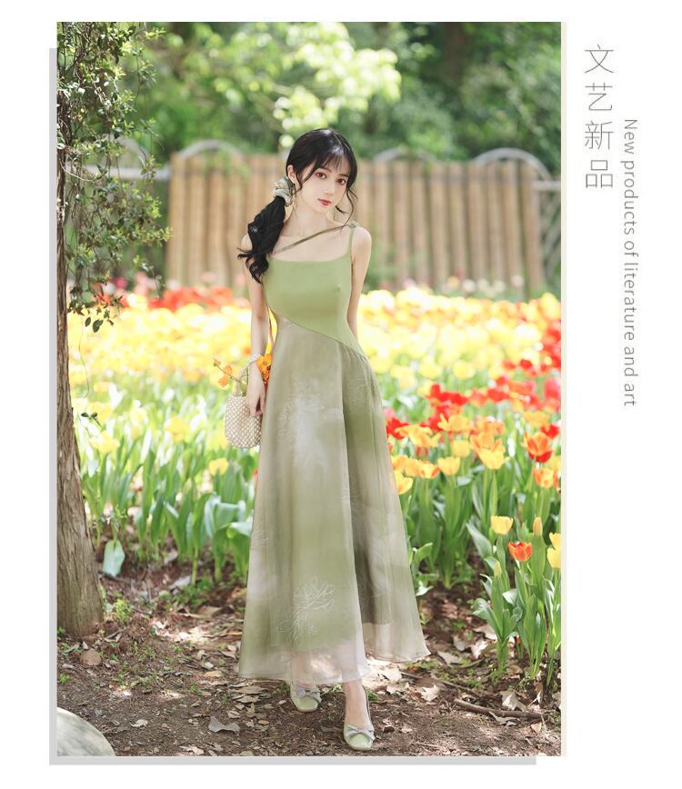 送料無料୨♥୧ サマーレディースグリーンロングドレス ヴィンテージプリントAラインミディノースリーブ 夏物 ビンテージ AOS94079888335