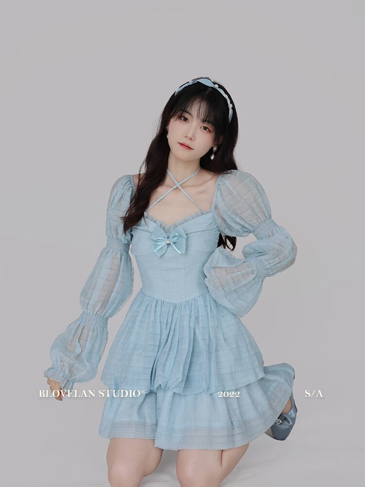 送料無料୨♥୧ スプリングオータムレディースミニドレス クロスカラーリボンウェストブルースリーブ レッド ランタンスリーブ 春物 秋物 スクウェア AOS85406379960
