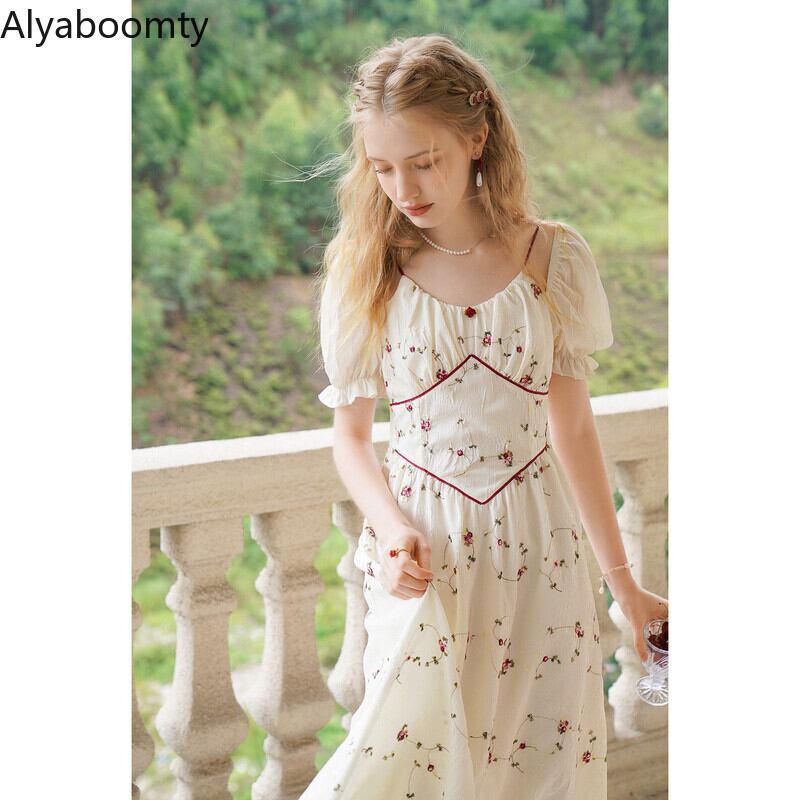 送料無料୨♥୧ サマーレディースロングドレス カラーストラップ フローラルジャカードスリーブ刺繍 夏物 花柄 スクウェア AOS17934771612