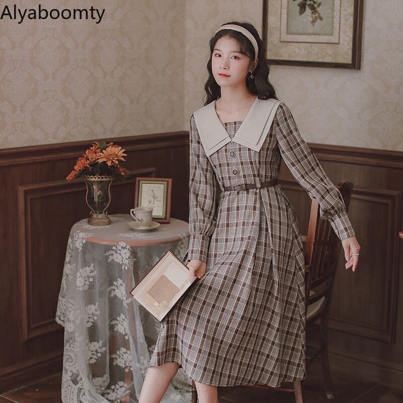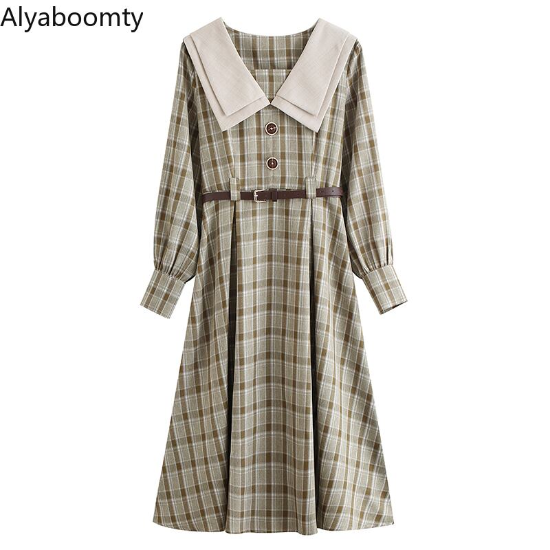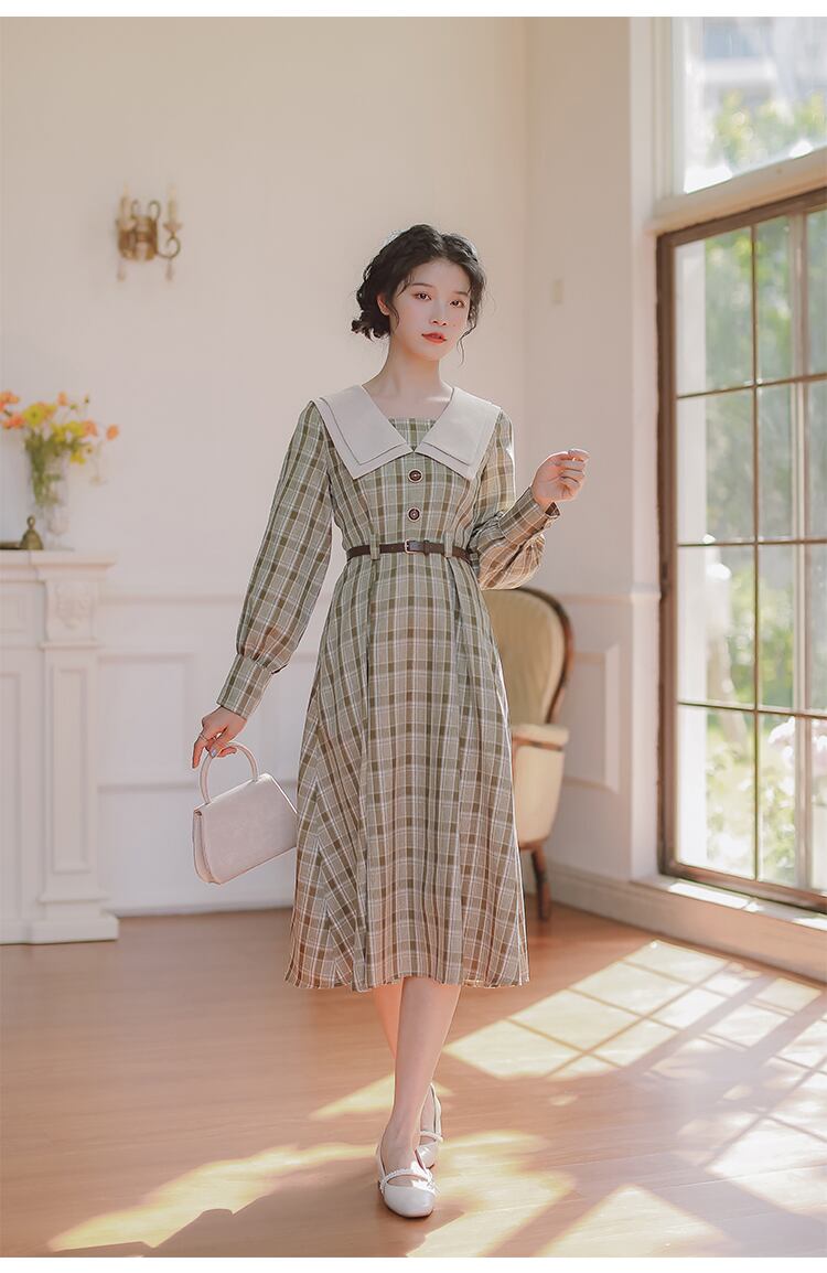 送料無料୨♥୧ スプリングレディースミディAラインドレス カラーグリーンカーキベルト 長袖スリーブ格子柄 ロング 大人ガーリー スウィート キュート カジュアル 春物 ハーネス AOS48394266072