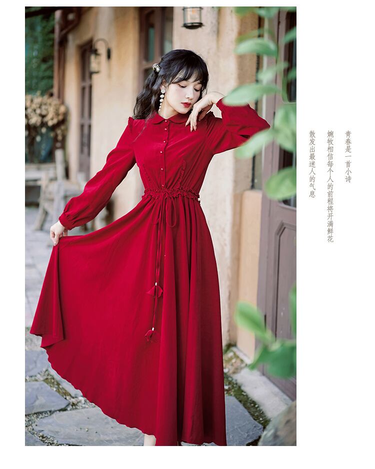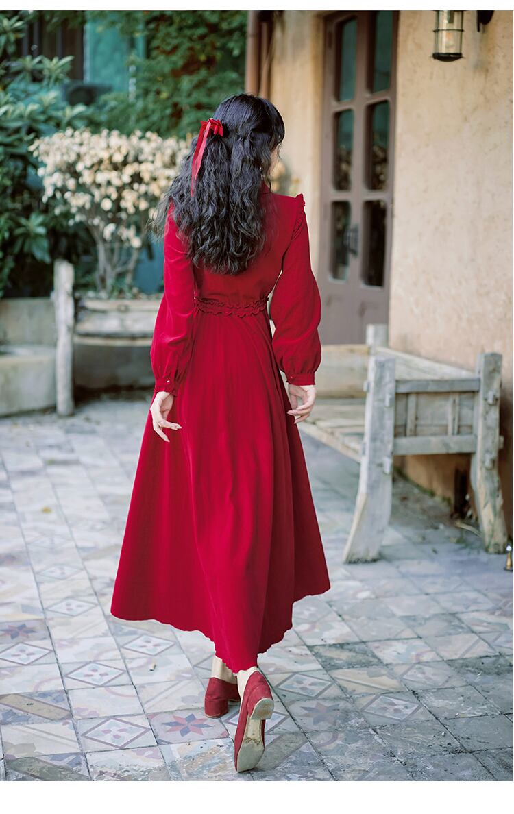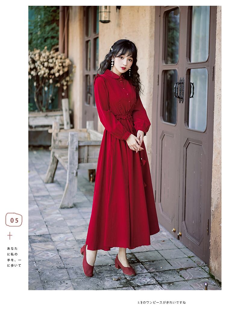 送料無料୨♥୧ スプリングオータムレディースロングドレス カラーレッドレーススリーブヴィンテージ 大人ガーリー スウィート キュート カジュアル 春物 秋物 レースアップ ビンテージ AOS15957434074