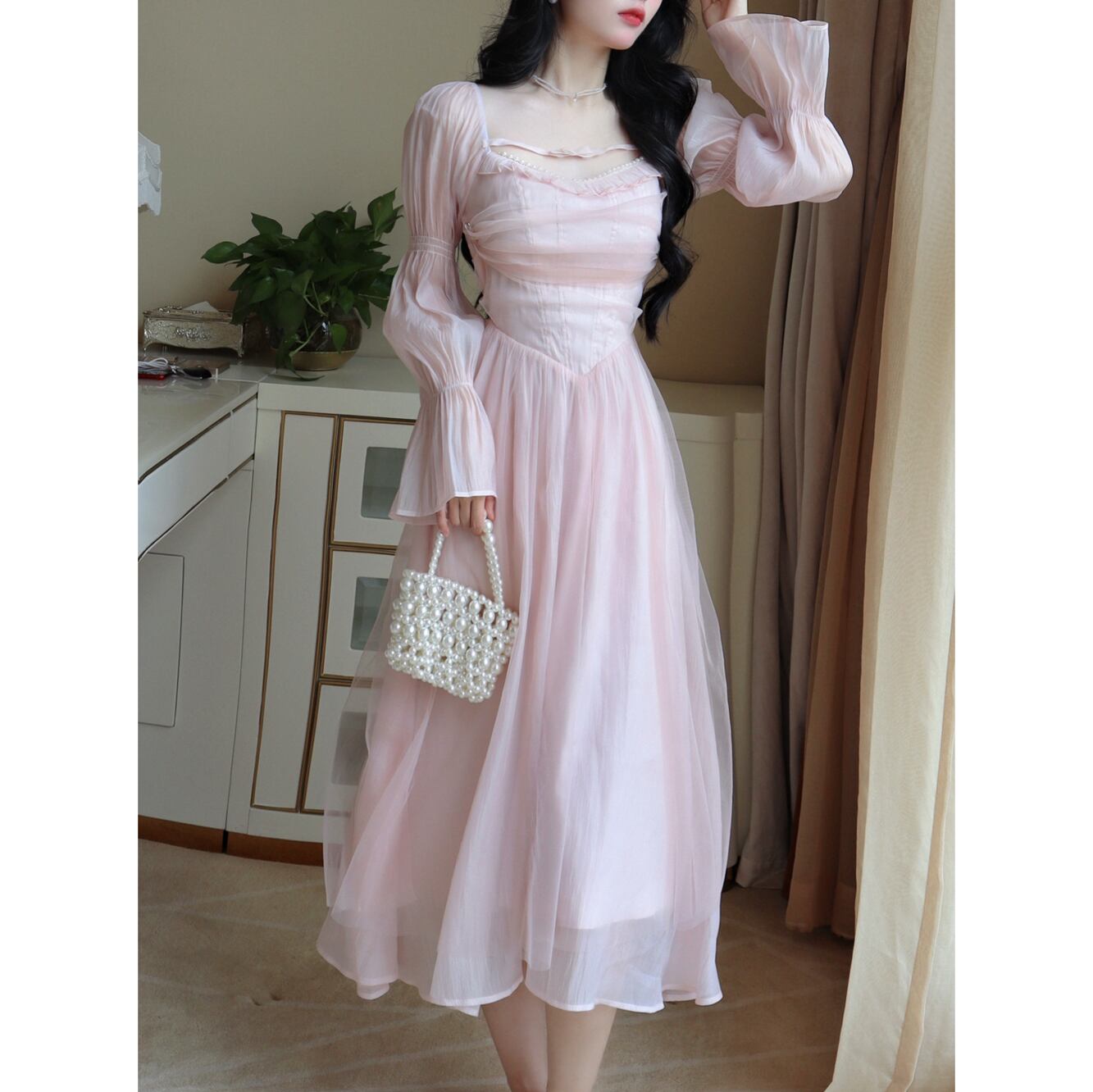 送料無料୨♥୧ スプリングオータムレディースミディAラインドレス カラーウェストシフォン長袖スリーブドレス ワンピース ロング ピンク 春物 秋物 スクウェア AOS56779184623