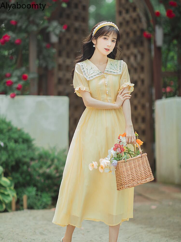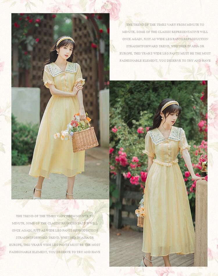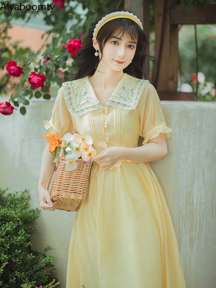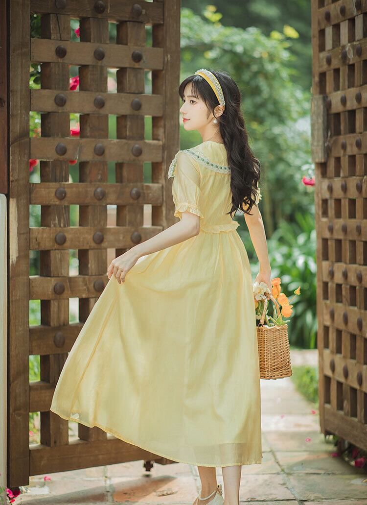 送料無料୨♥୧ サマーレディースイエローAラインドレス カラーフローラル刺繍ヴィンテージ 大人ガーリー スウィート キュート カジュアル 夏物 花柄 ビンテージ AOS63886713495