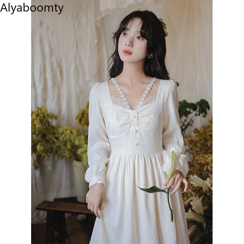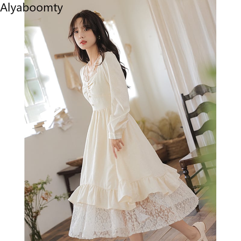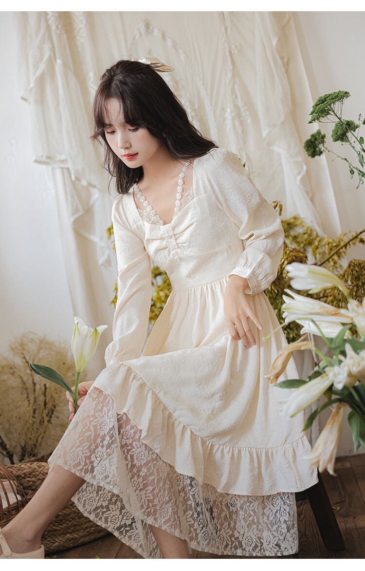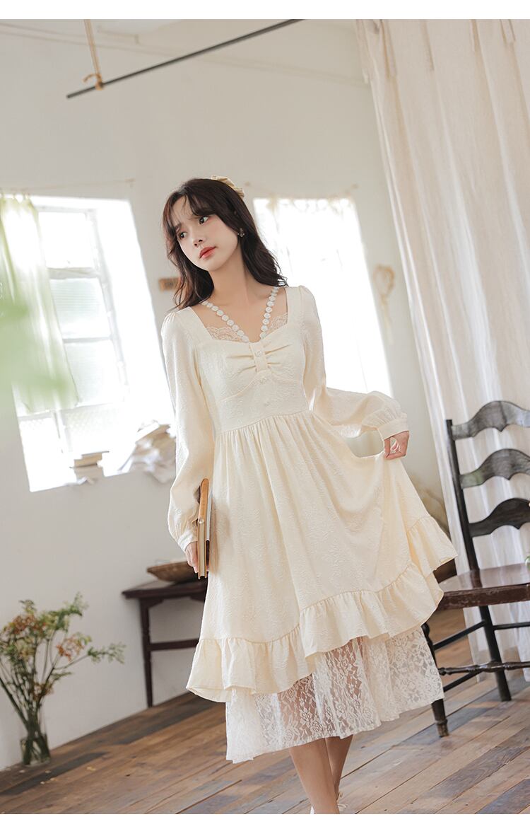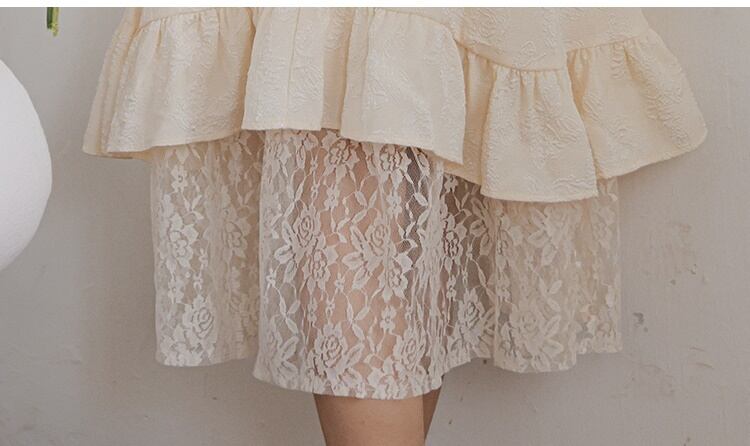 送料無料୨♥୧ スプリングオータムレディースドレス カラージャカードフローラルレースフリルミディ ラッフル 大人ガーリー スウィート キュート カジュアル 春物 秋物 花柄 スクウェア AOS36435610132