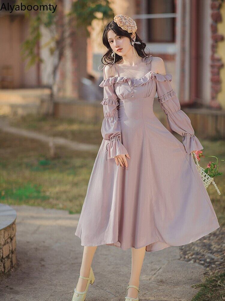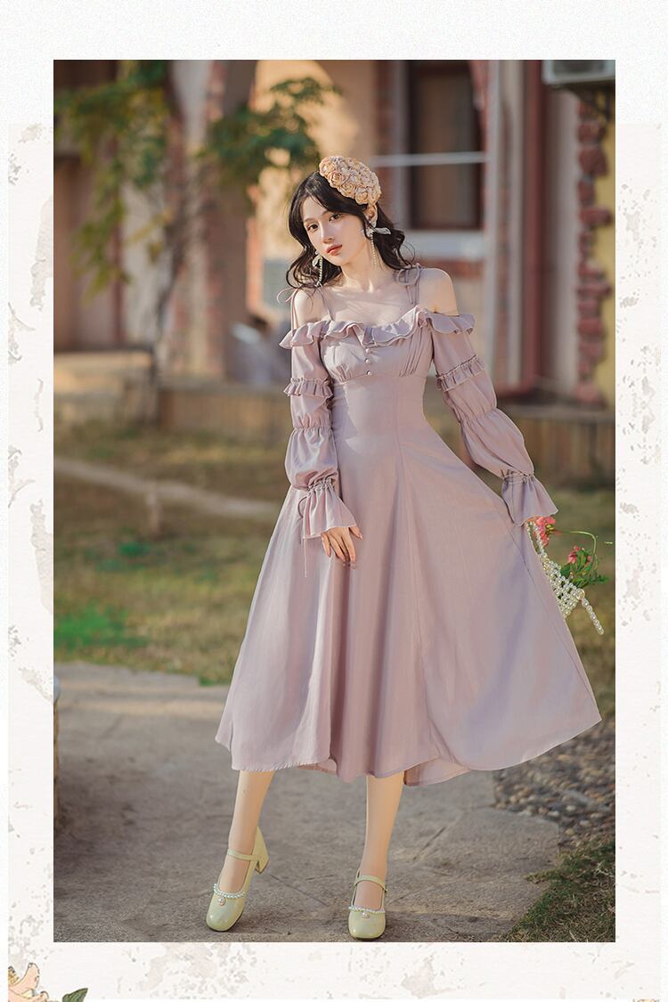 送料無料୨♥୧ スプリングオータムレディースミディドレス ストラップ フリルスリーブ フレアスリーブ ラッフル 春物 秋物 AOS70616719579