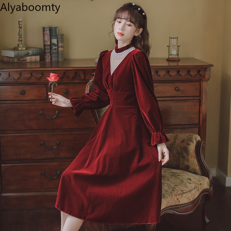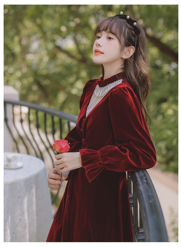 送料無料୨♥୧ オータムウィンターレディースベルベットドレス パールレッドメッシュパッチワーク長袖スリーブ ロング 大人ガーリー スウィート キュート カジュアル 秋物 冬物 真珠 AOS29427988596