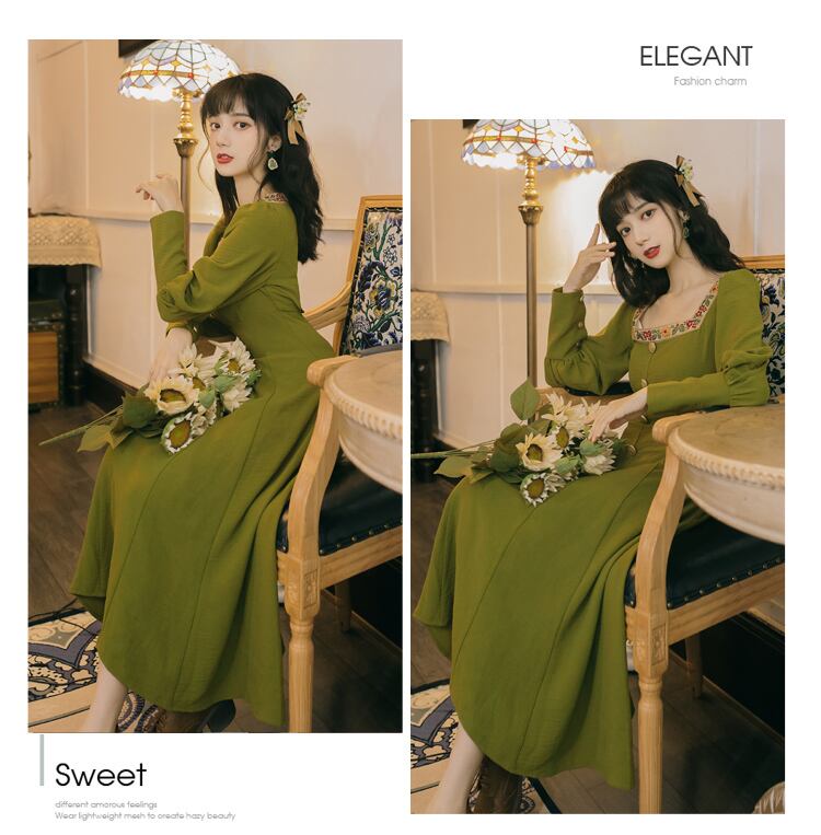 送料無料୨♥୧ スプリングオータムレディースミディドレス カラーヴィンテージグリーンスリムスリーブフローラル刺繍 ランタンスリーブ 春物 秋物 花柄 スクウェア ビンテージ AOS31405988381