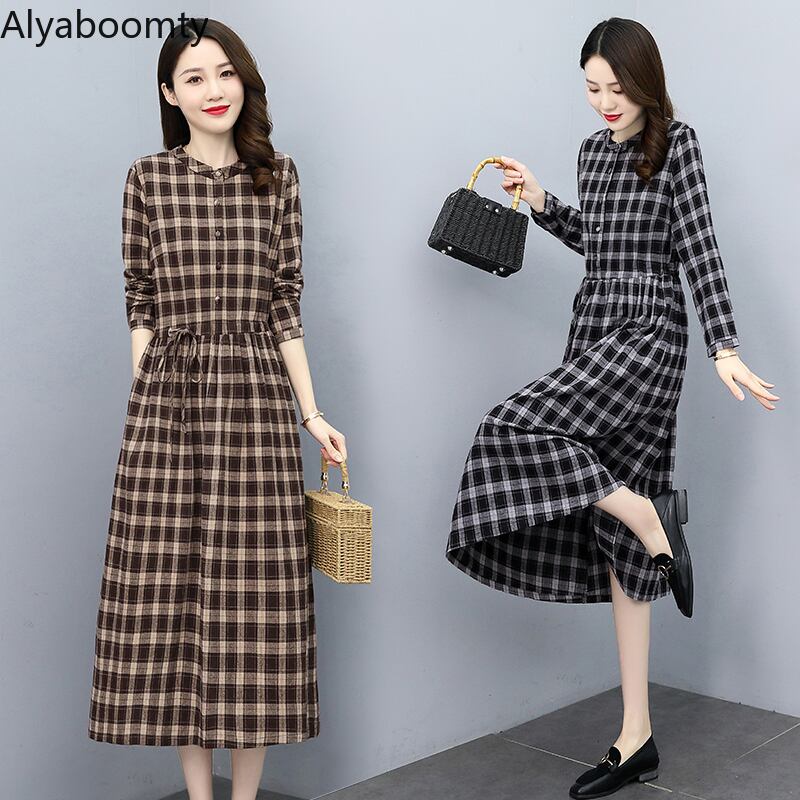 送料無料୨♥୧ スタイルオータムウィンターレディースルーズドレス ブラックブラウン格子柄レースヴィンテージ長袖スリーブ ロング 秋物 冬物 Oネック レースアップ ビンテージ AOS29779767596