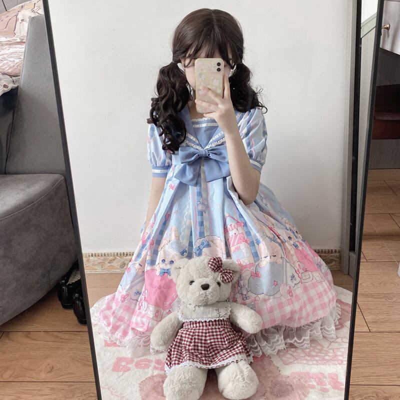 送料無料୨♥୧ サマーレディースドレス カラーブループリント柄格子柄レースフリル ピンク ラッフル 大人ガーリー スウィート キュート カジュアル 夏物 AOS89946398870