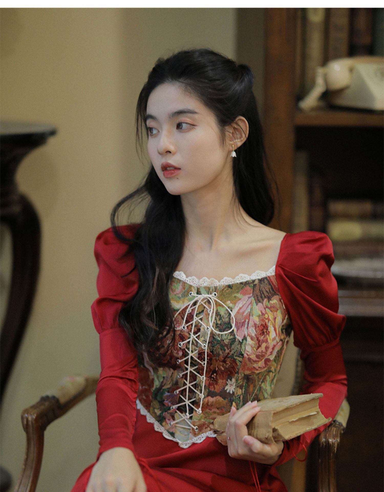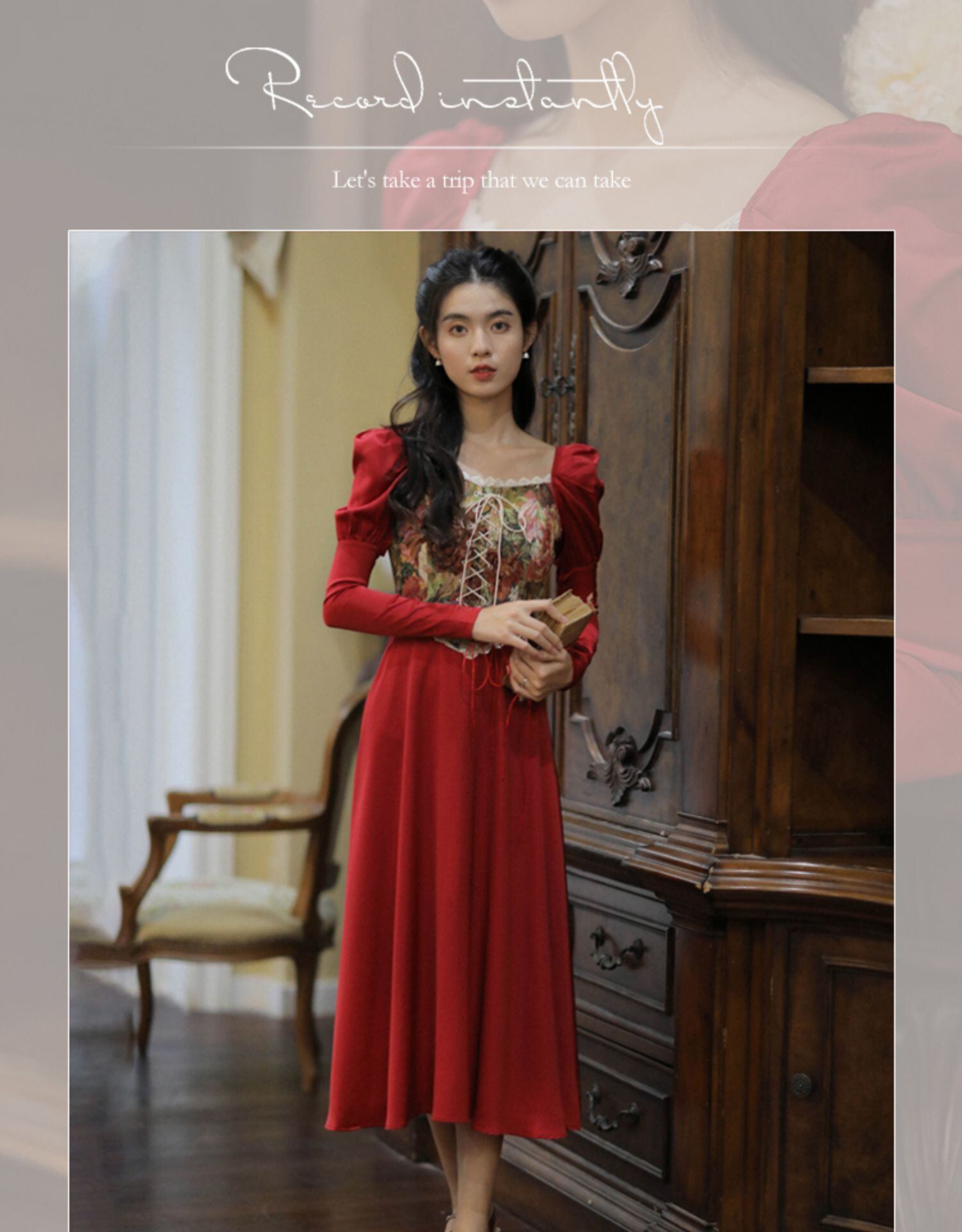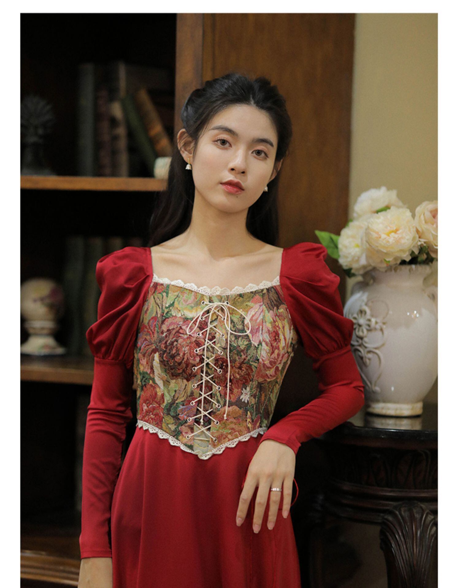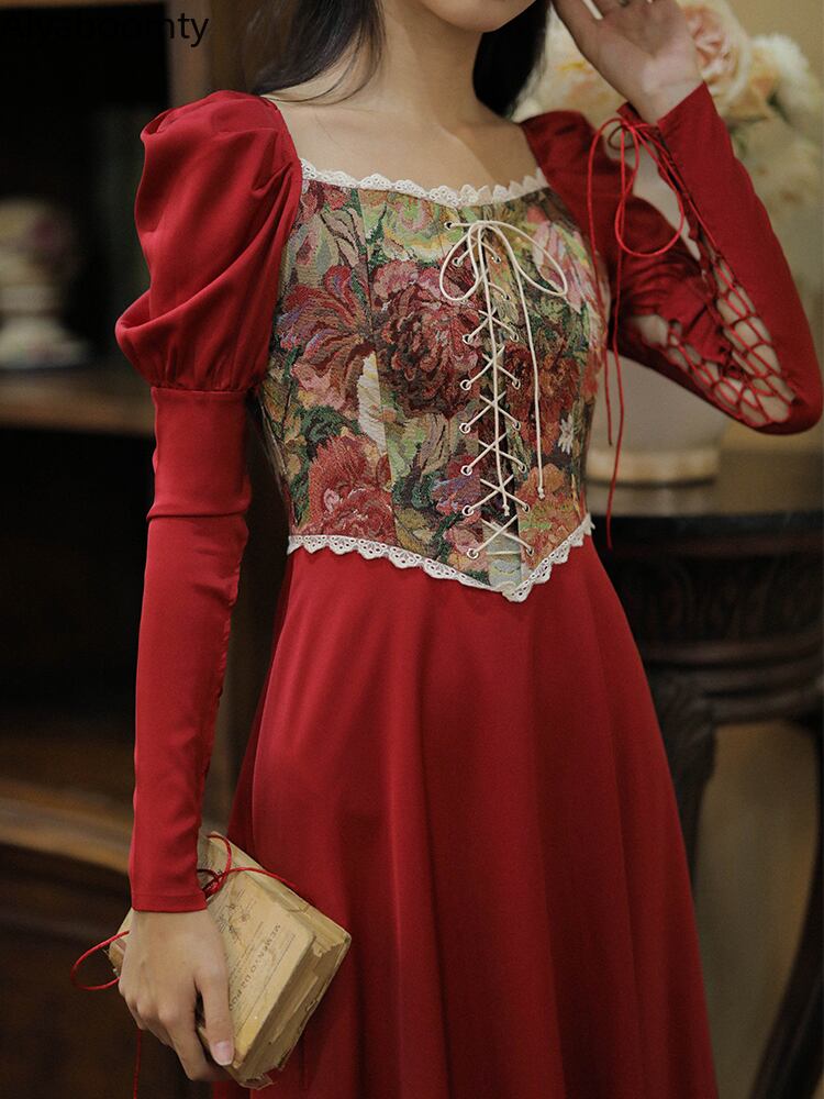 送料無料୨♥୧ スプリングオータムレディースロングミディヴィンテージドレス カラージャカードレースバンドレッドスリーブ 春物 秋物 スクウェア ビンテージ AOS7406339715