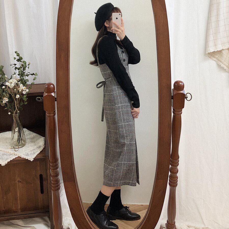 送料無料୨♥୧ スタイルオータムウィンターレディースウールドレス 格子柄ミディノースリーブヴィンテージ 秋物 冬物 ハーネス ベルト ビンテージ ヨーロピアン AOS88995474599