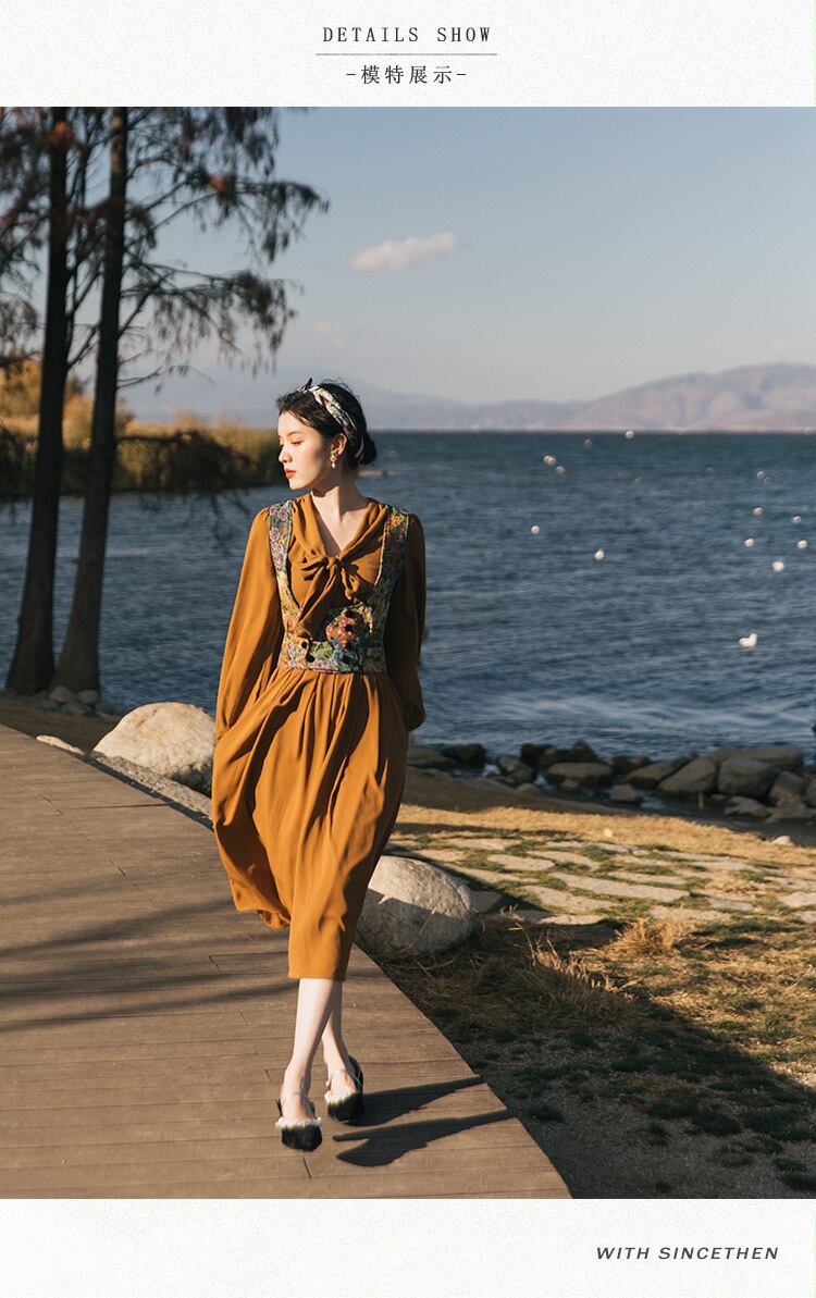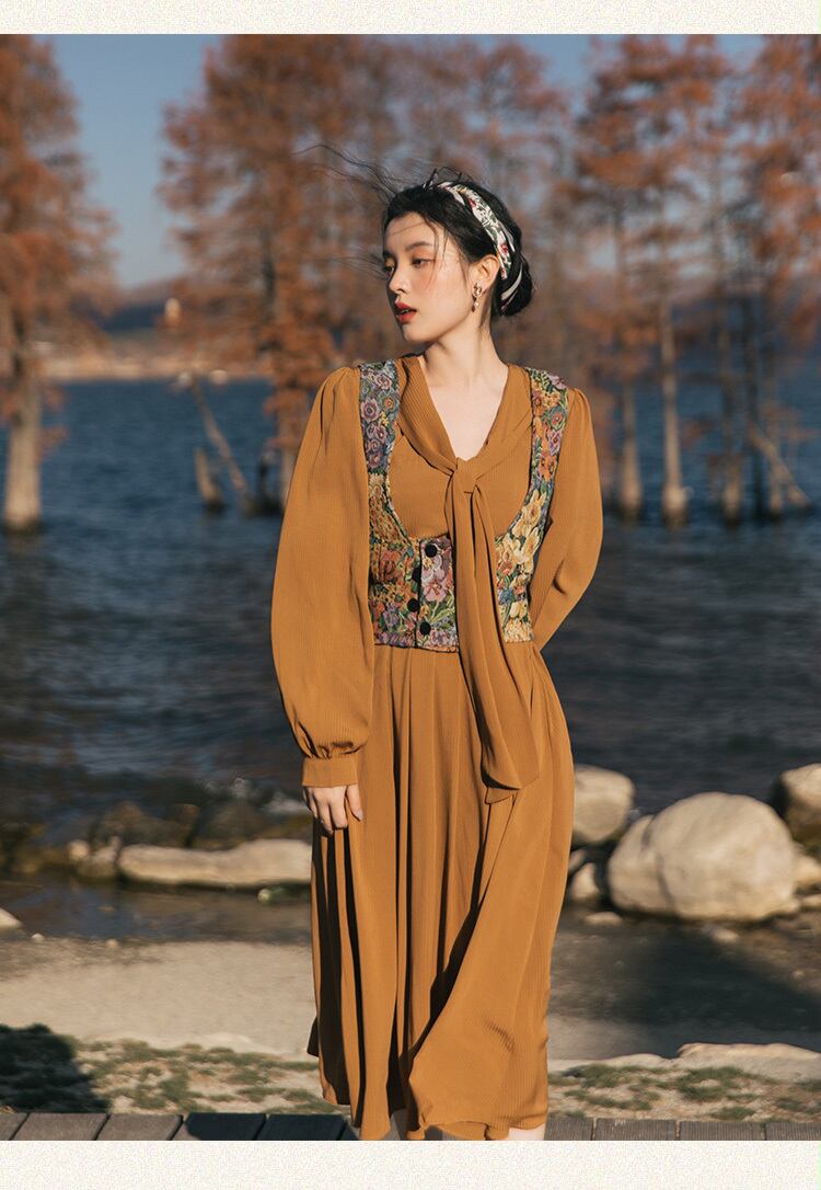 送料無料୨♥୧ スタイルスプリングオータムレディースドレス Vネックオレンジスリーブミディフローラルヴィンテージ 春物 秋物 花柄 ビンテージ ヨーロピアン AOS52903310702