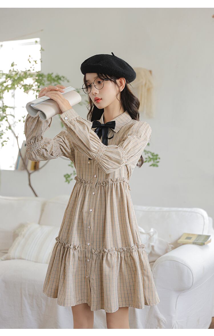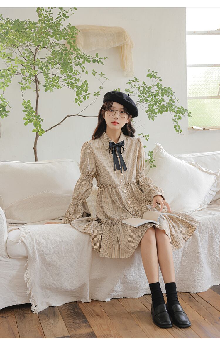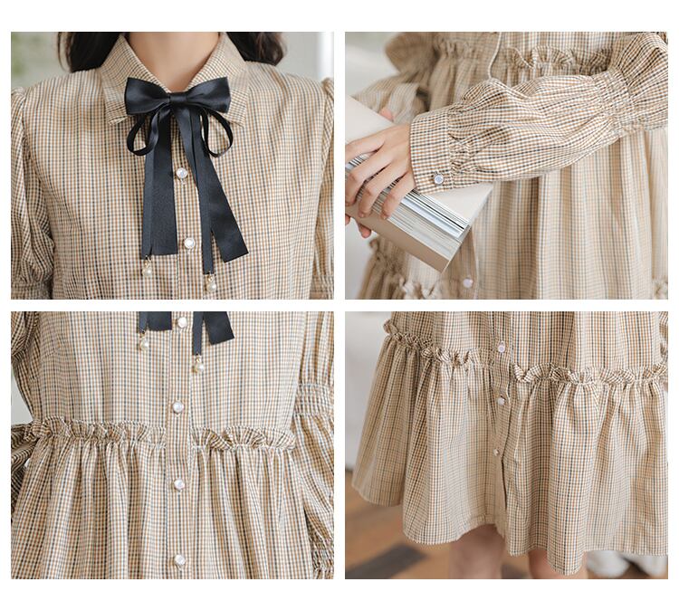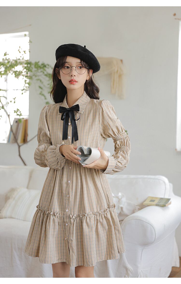 送料無料୨♥୧ スタイルスプリングオータムレディース格子柄ドレス カラーリボンミニフリルシャツ ラッフル 大人ガーリー スウィート キュート カジュアル 春物 秋物 AOS79398356591
