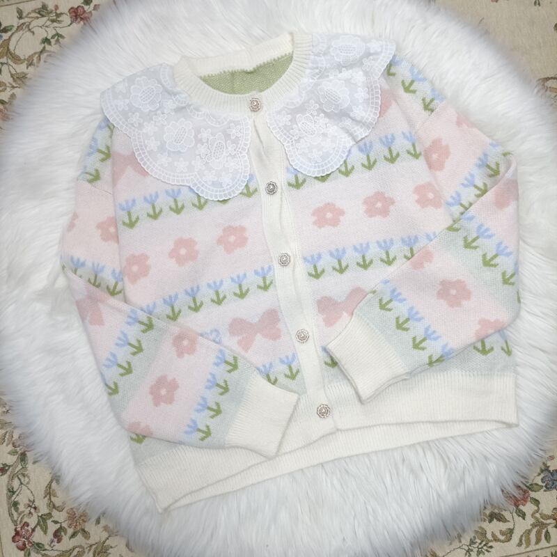 送料無料୨♥୧ スプリングオータムレディースセーター カラーレースフローラルニットアウターカーディガン 大人ガーリー スウィート キュート カジュアル 春物 秋物 花柄 AOS35751649792