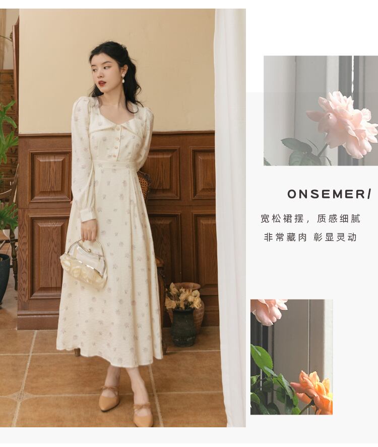 送料無料୨♥୧ スプリングレディースミディドレス カラーフローラルプリントスリーブジャカードドレス ワンピース 春物 花柄 スクウェア AOS4521211047