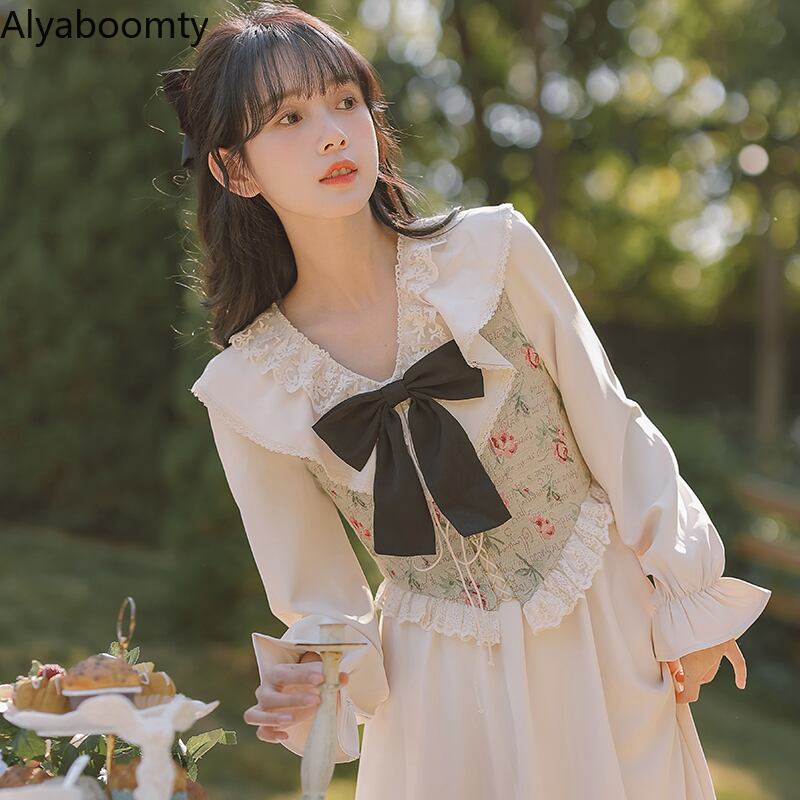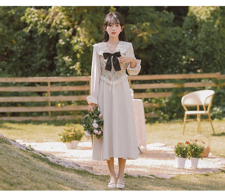 送料無料୨♥୧ スプリングオータムレディースソリッド ドレス Vネックレースフリルリボンミディスタイル ラッフル 大人ガーリー スウィート キュート カジュアル 春物 秋物 ソリッドカラー AOS45487430043