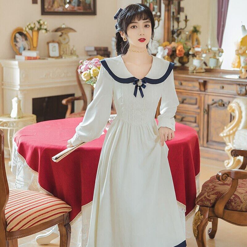 送料無料୨♥୧ スタイルレディースホワイトロングドレス カラーリボン長袖スリーブ 大人ガーリー スウィート キュート カジュアル AOS13028525324
