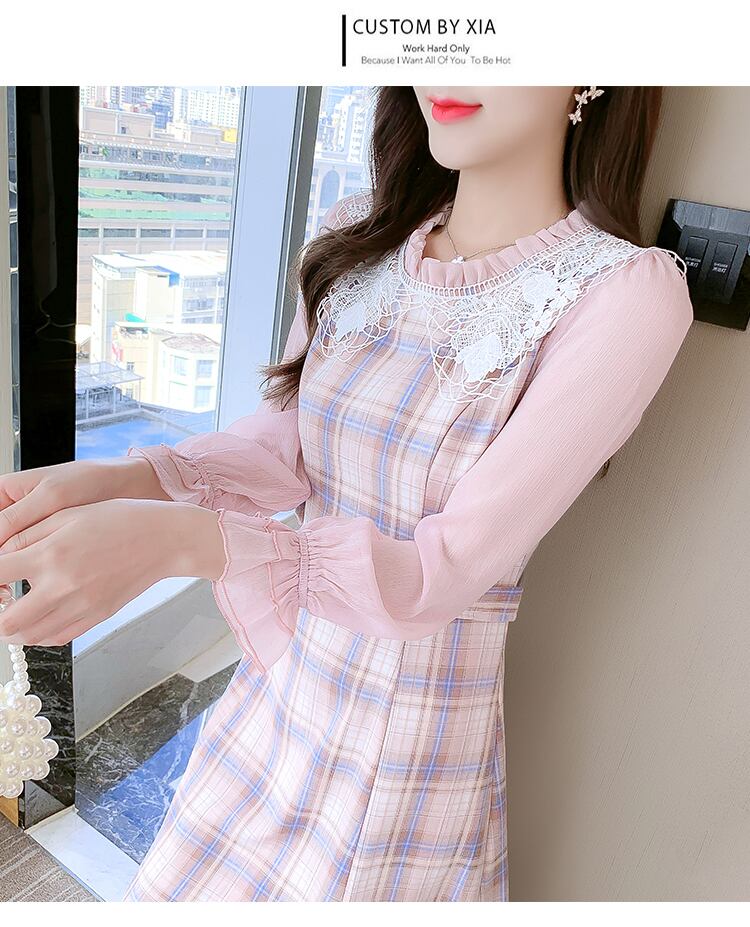 送料無料୨♥୧ スプリングオータムレディースAラインドレス レースパッチワーク格子柄長袖スリーブシフォン ロング 大人ガーリー スウィート キュート カジュアル 春物 秋物 Oネック AOS14940631548