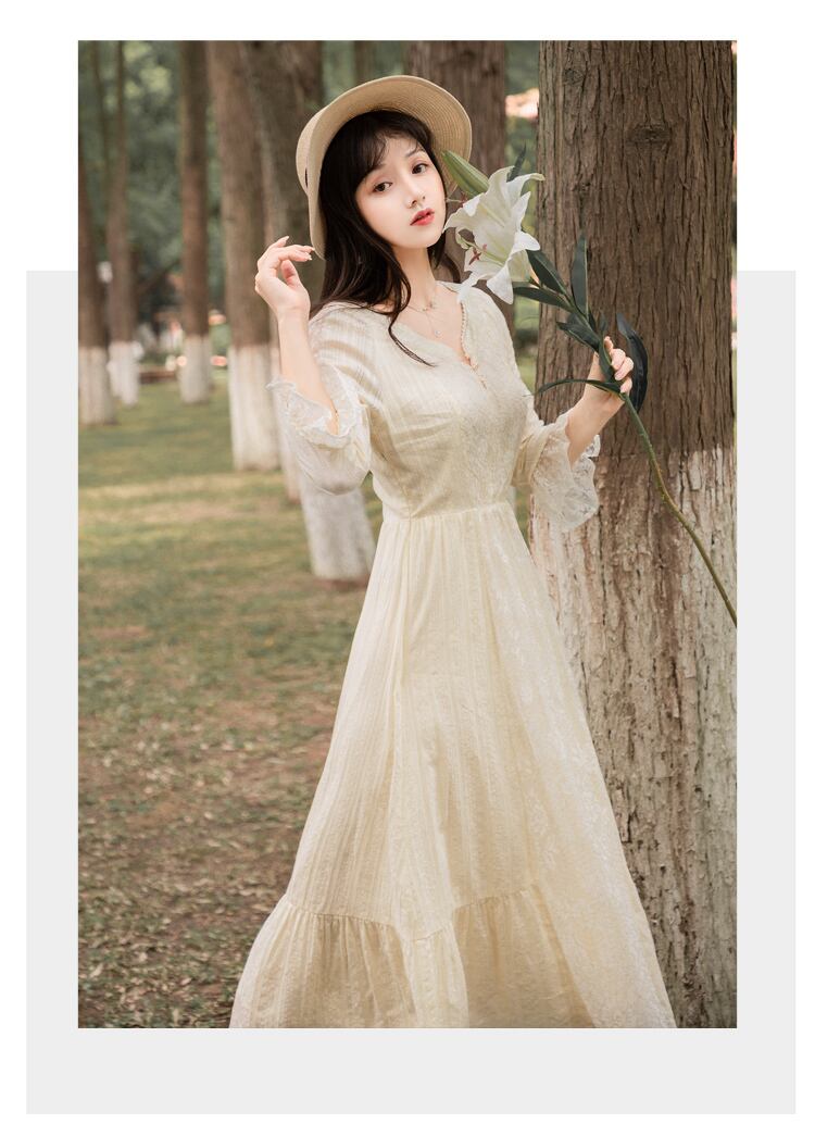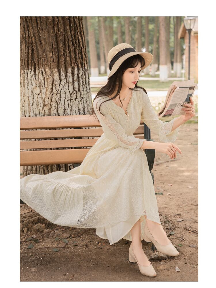 送料無料୨♥୧ スプリングオータムレディースAラインドレス パッチワークフローラルレース七部袖スリーブフリルミディ ラッフル 大人ガーリー スウィート キュート カジュアル 春物 秋物 花柄 AOS87738870656