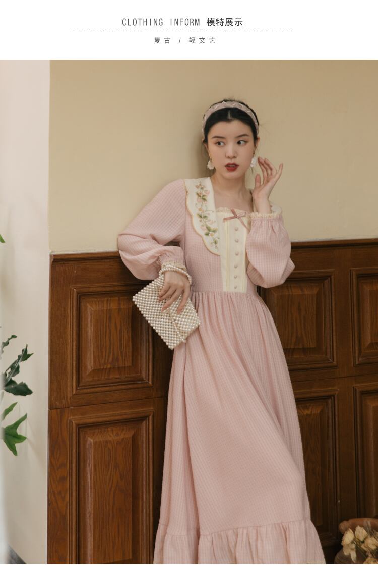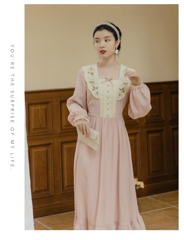 送料無料୨♥୧ スプリングレディースロングドレス カラー格子柄フリルスタイルフローラル刺繍ヴィンテージ ピンク ラッフル 大人ガーリー スウィート キュート カジュアル 春物 花柄 スクウェア ビンテージ AOS84046482658
