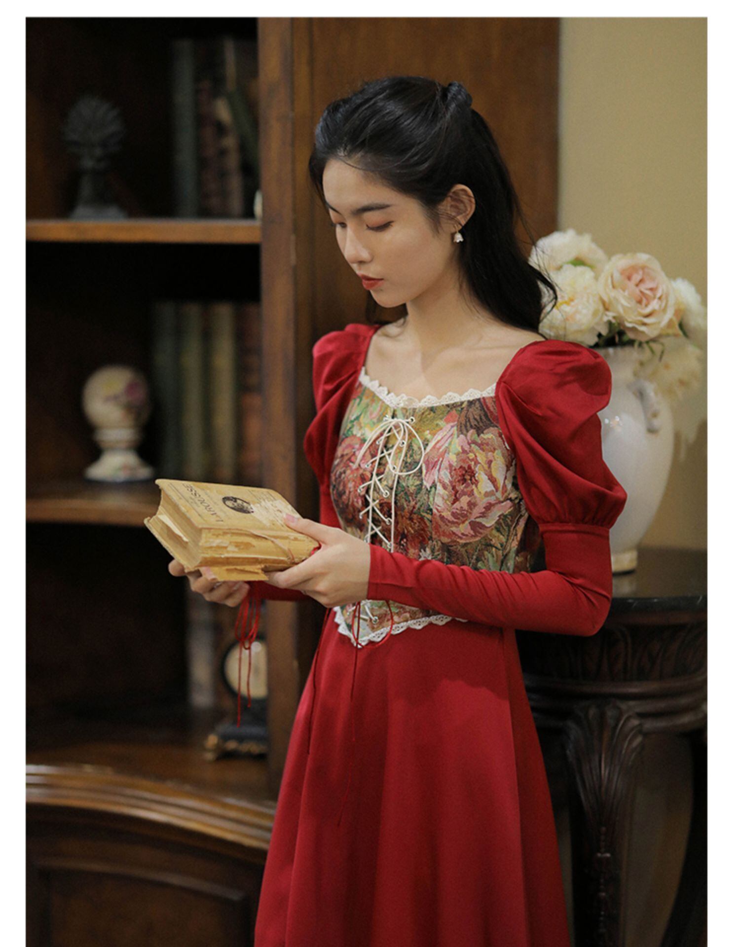 送料無料୨♥୧ スプリングオータムレディースロングミディヴィンテージドレス カラージャカードレースバンドレッドスリーブ 春物 秋物 スクウェア ビンテージ AOS60362714722