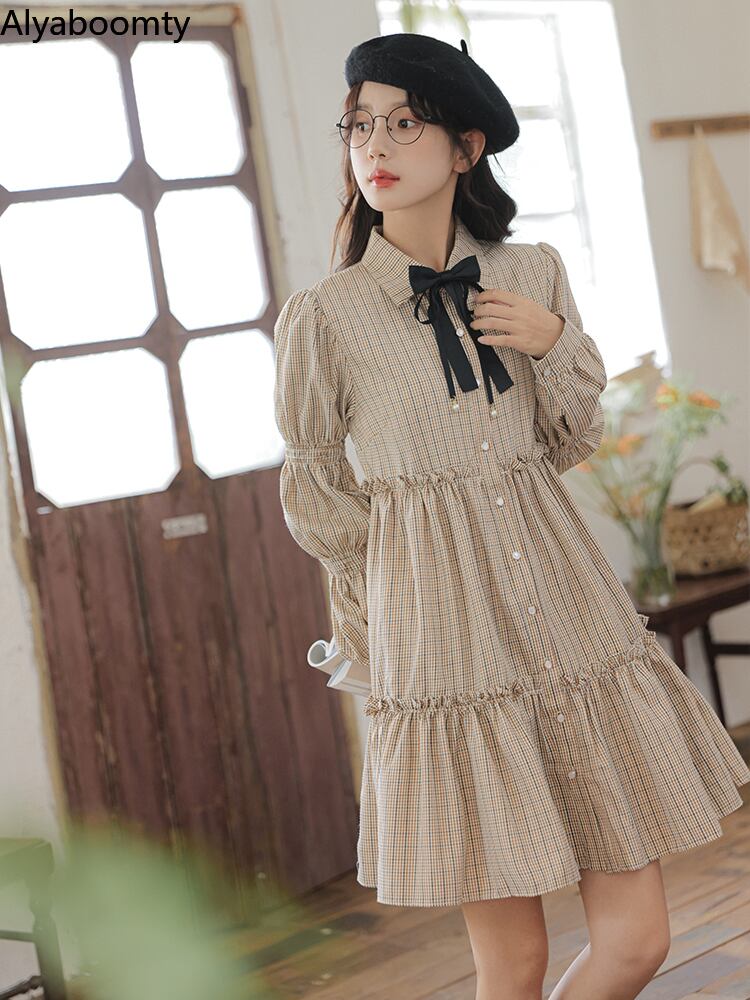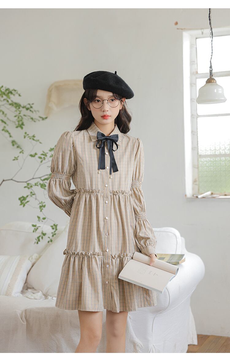 送料無料୨♥୧ スタイルスプリングオータムレディース格子柄ドレス カラーリボンミニフリルシャツ ラッフル 大人ガーリー スウィート キュート カジュアル 春物 秋物 AOS82206415032