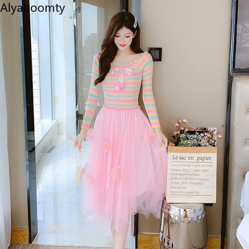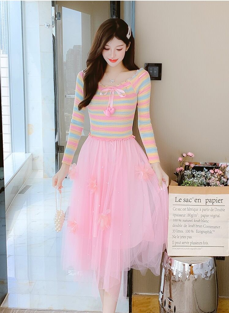 送料無料୨♥୧ オータムウィンターレディースミディドレス ストライプパッチワークフローラルメッシュ 大人ガーリー スウィート キュート カジュアル 秋物 冬物 花柄 AOS1960640242
