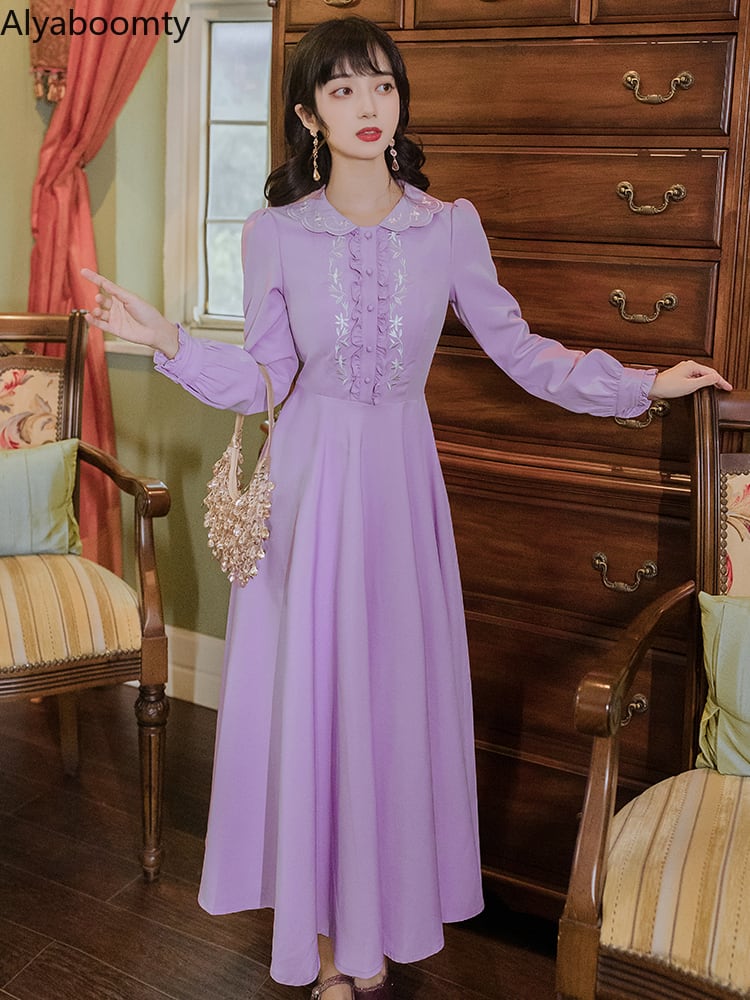送料無料୨♥୧ スプリングオータムレディーススリムドレス カラーフローラル刺繍ミディ 大人ガーリー スウィート キュート カジュアル 春物 秋物 花柄 パープル AOS15596105409