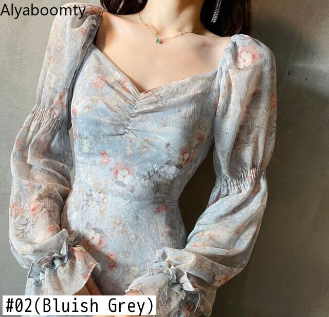 送料無料୨♥୧ スプリングオータムレディースフローラルドレス Vネックプリント長袖スリーブシフォン ロング 春物 秋物 花柄 AOS84220857494