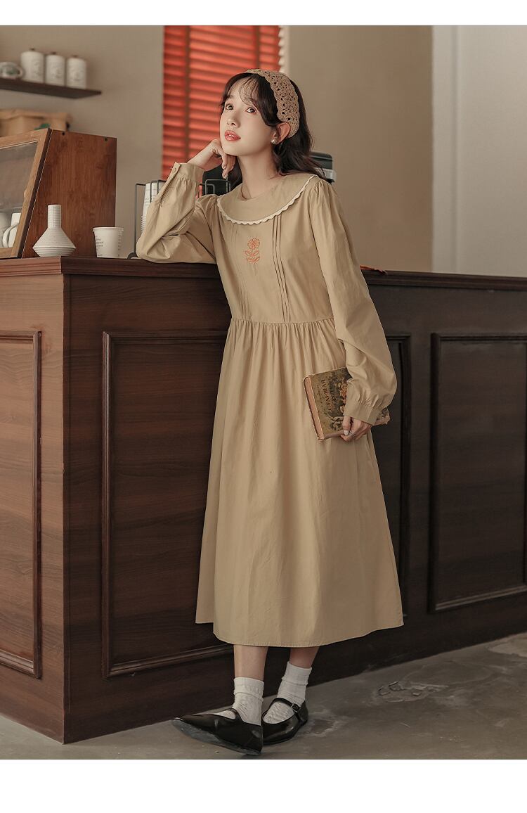 送料無料୨♥୧ スプリングオータムレディースミディドレス フローラル刺繍ヴィンテージ長袖スリーブスタンダードルーズ ロング コットン レトロ 大人ガーリー スウィート キュート カジュアル 春物 秋物 花柄 Oネック ビンテージ AOS3358396735