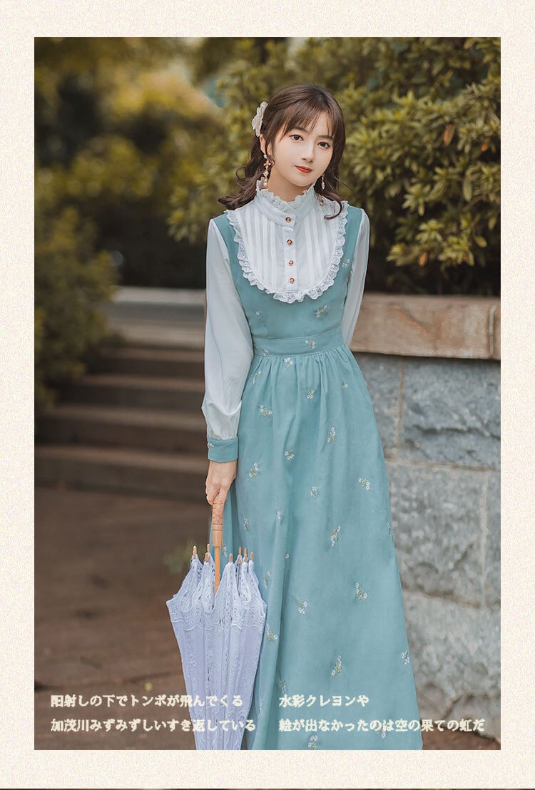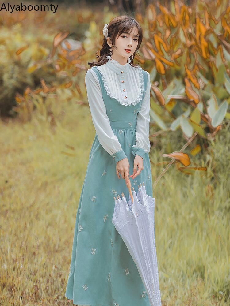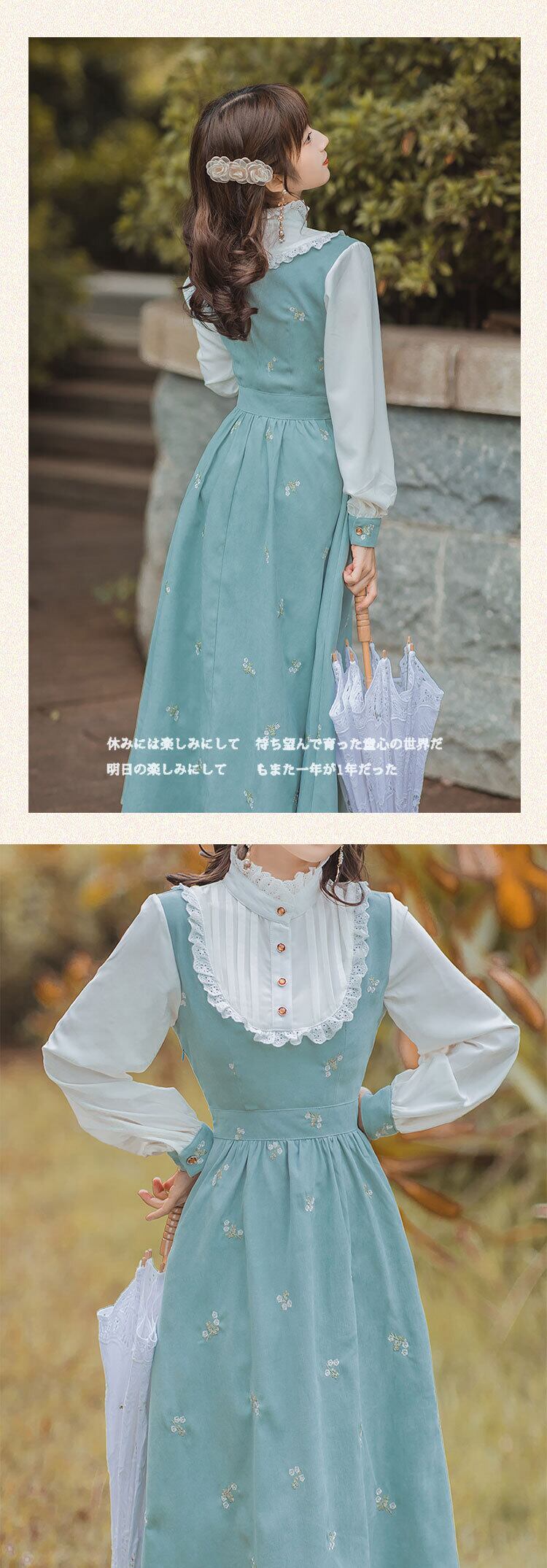 送料無料୨♥୧ スプリングオータムレディースコーデュロイドレス カラーパッチワークレースフリルフローラル刺繍グリーン ラッフル 大人ガーリー スウィート キュート カジュアル 春物 秋物 花柄 AOS7812008546