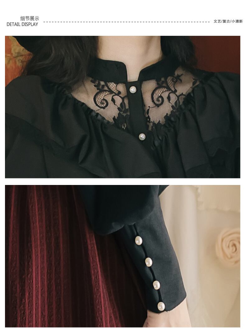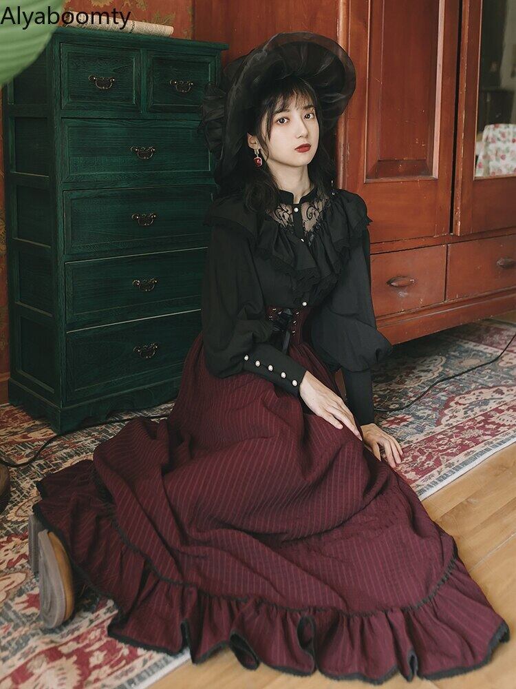 送料無料୨♥୧ スタイルレディースセット ブラックスリーブレースフリルマキシロングスカート ランタンスリーブ ラッフル ヨーロピアン AOS87351930739