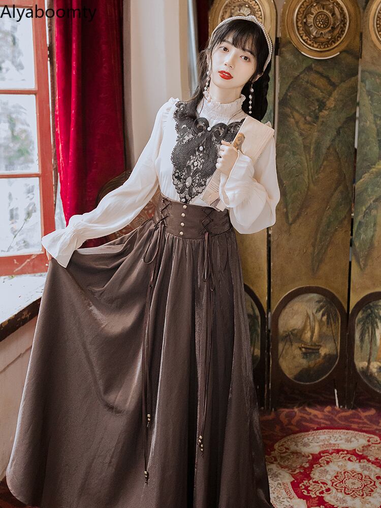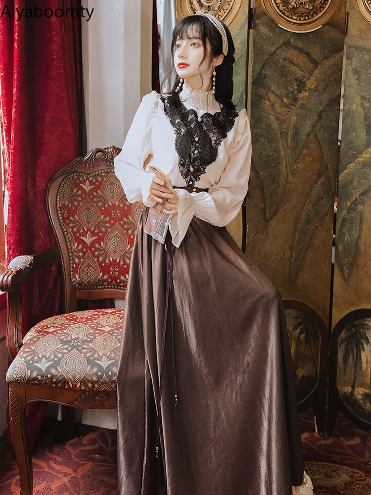 送料無料୨♥୧ スタイルオータムレディースセット カラーレースフリルバンドウェストスカート ヴィンテージ ラッフル ブラウス 秋物 ビンテージ ヨーロピアン AOS71384972043