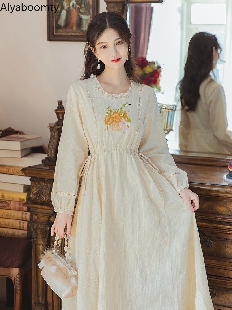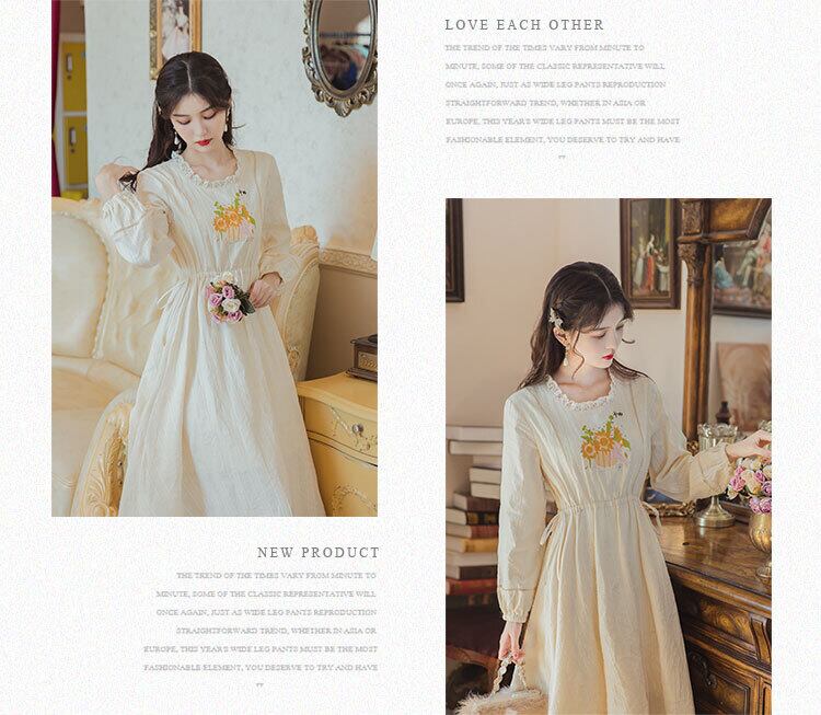 送料無料୨♥୧ スプリングオータムレディースヴィンテージドレス レースミディ刺繍スタンダード コットン レトロ 大人ガーリー スウィート キュート カジュアル 春物 秋物 Oネック フラワーデザイン ビンテージ AOS62985256794