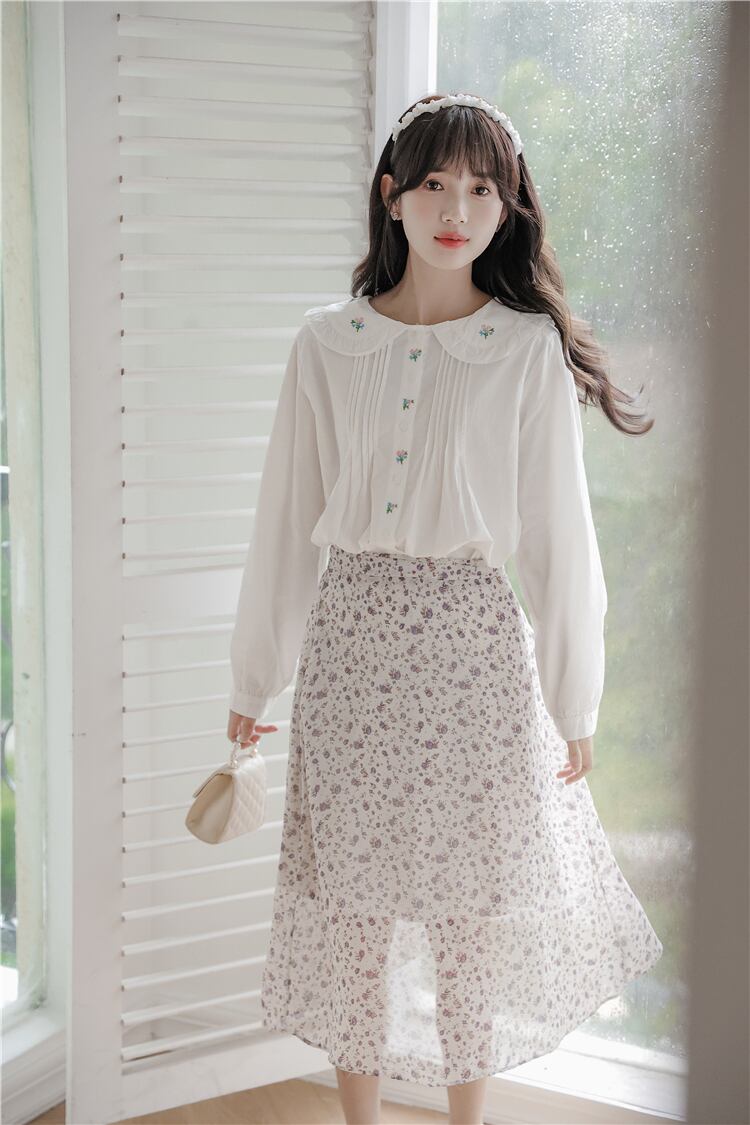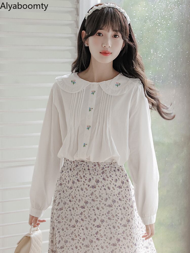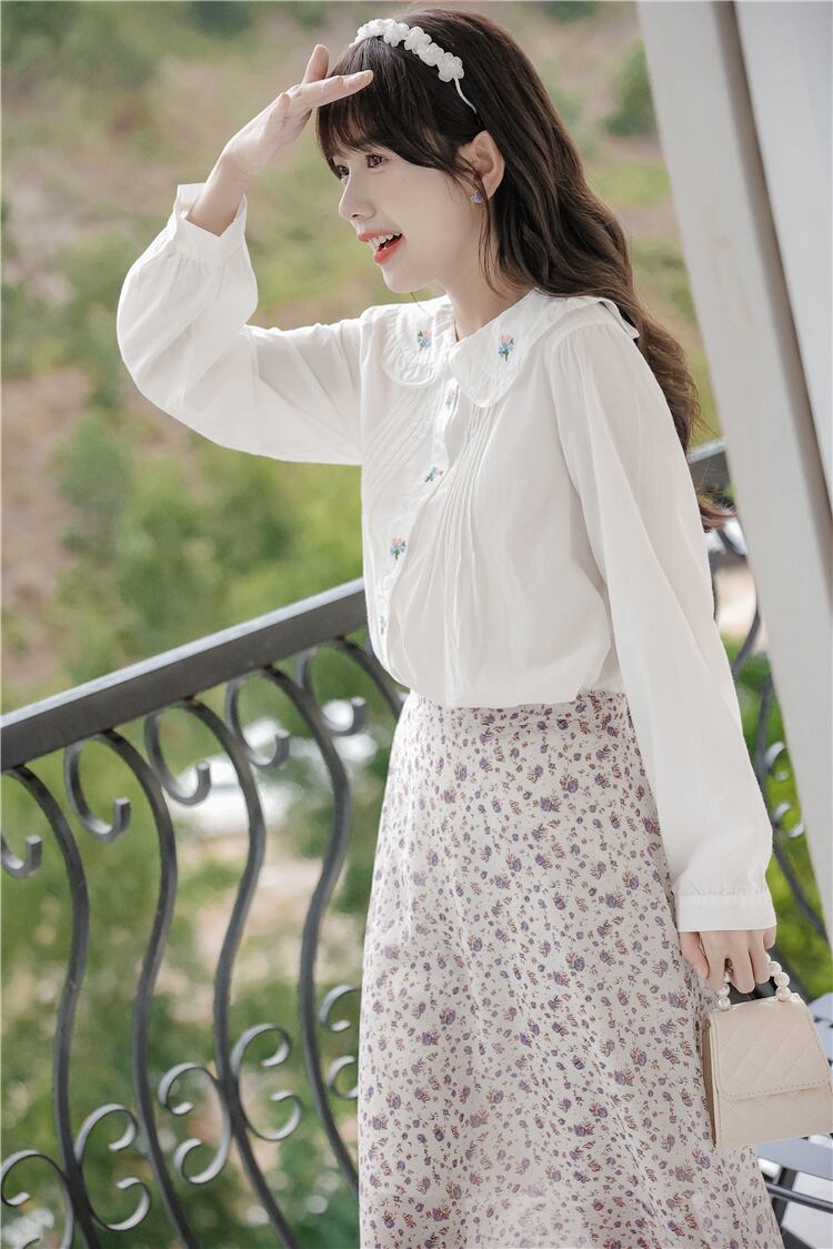 送料無料୨♥୧ スプリングオータムレディースホワイトブラウス カラールーズシャツ スタイルフローラル刺繍トップス コットン 大人ガーリー スウィート キュート カジュアル 春物 秋物 花柄 AOS22326255999