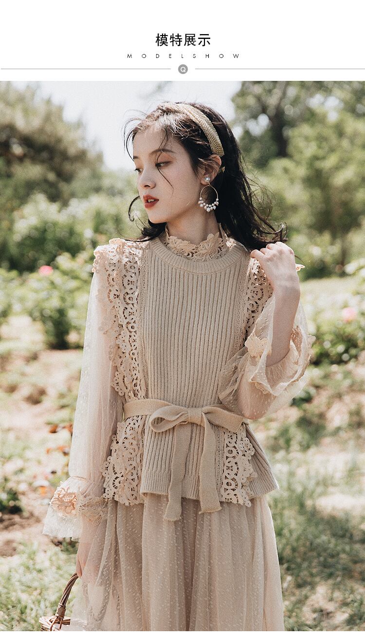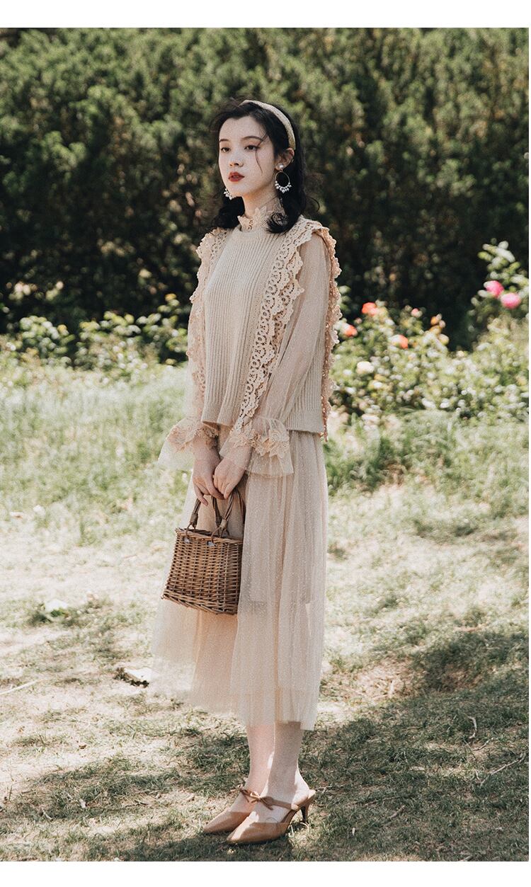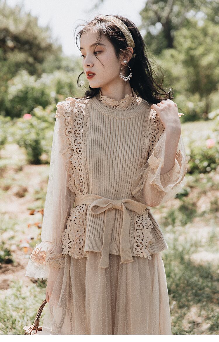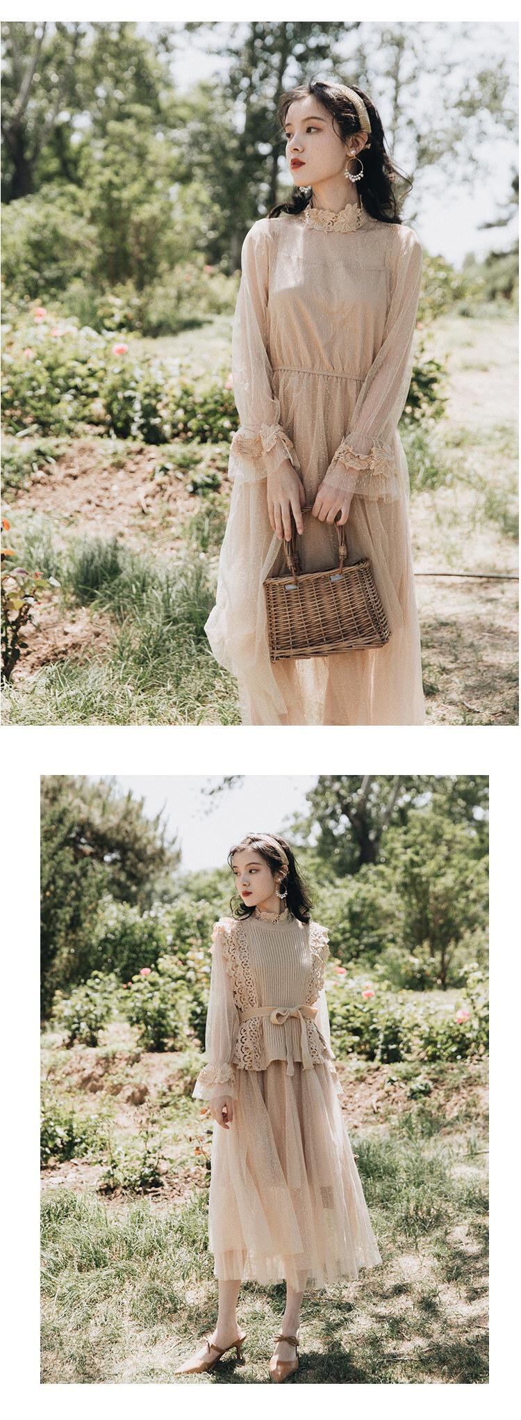 送料無料୨♥୧ オータムウィンターレディースドレス レース刺繍カーキ 大人ガーリー スウィート キュート カジュアル 秋物 冬物 AOS59750681029