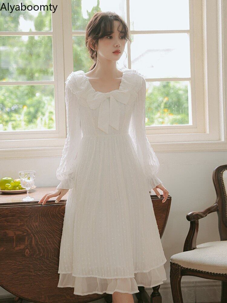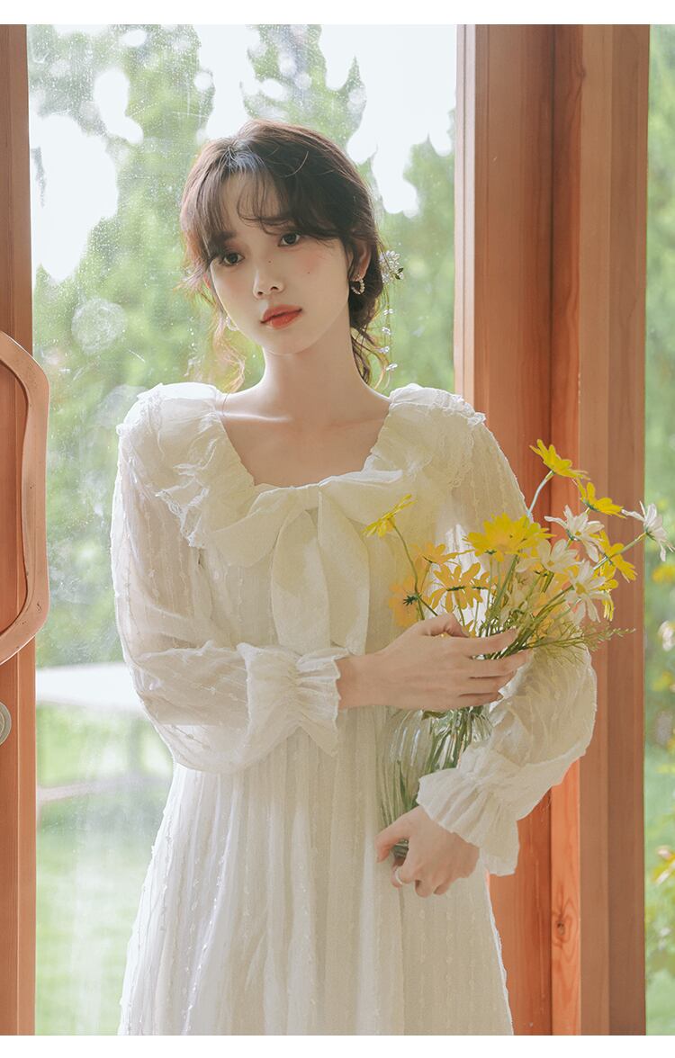 送料無料୨♥୧ スプリングオータムレディースホワイトミディドレス カラーリボンウェストフリル ラッフル 大人ガーリー スウィート キュート カジュアル 春物 秋物 スクウェア AOS82658497609
