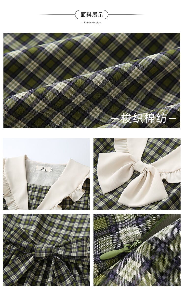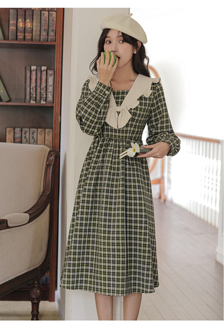 送料無料୨♥୧ オータムウィンターレディースグリーンドレス カラーリボン格子柄ヴィンテージスタイルミディ 大人ガーリー スウィート キュート カジュアル 秋物 冬物 ビンテージ AOS39871898589