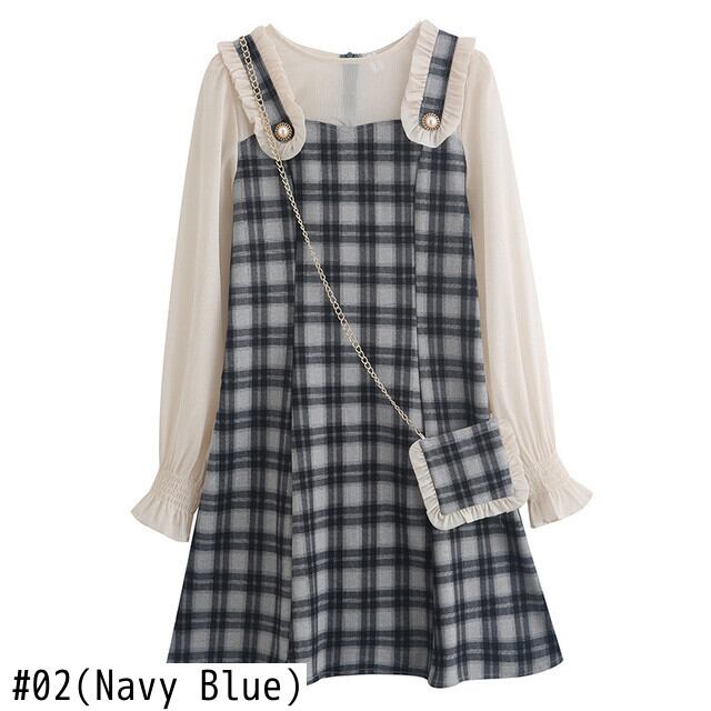 送料無料୨♥୧ スプリングオータムレディースミニドレス ネイビーブルーグリーンパッチワーク格子柄ショートスタイル 大人ガーリー スウィート キュート カジュアル 春物 秋物 AOS4865830890