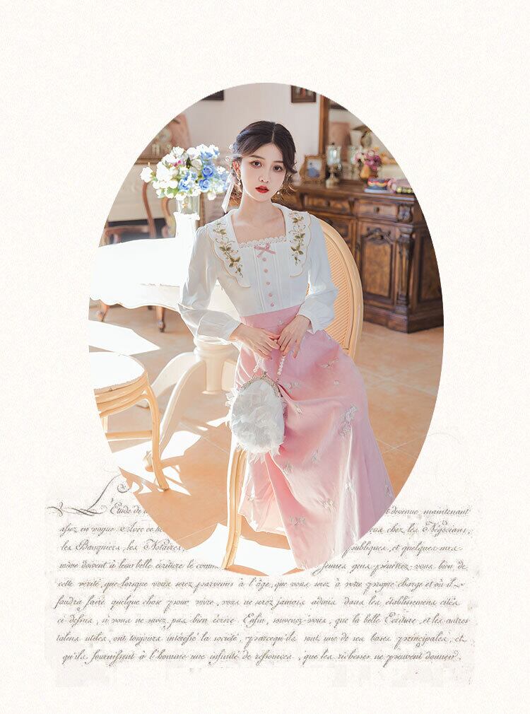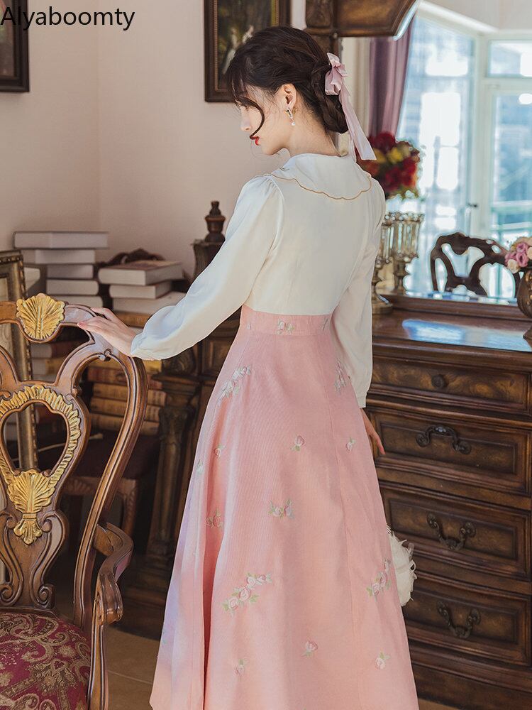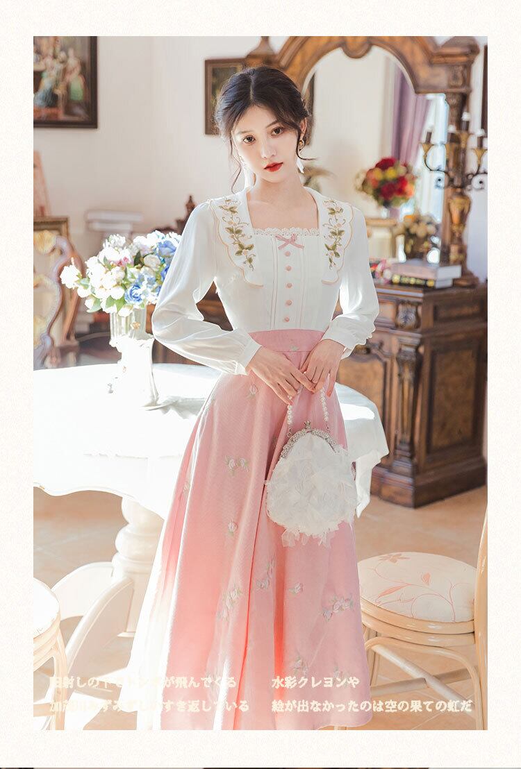 送料無料୨♥୧ スプリングオータムレディースドレス カラーフローラル刺繍ヴィンテージドレス ワンピース ピンク ホワイト 大人ガーリー スウィート キュート カジュアル 春物 秋物 花柄 ビンテージ AOS91112098674