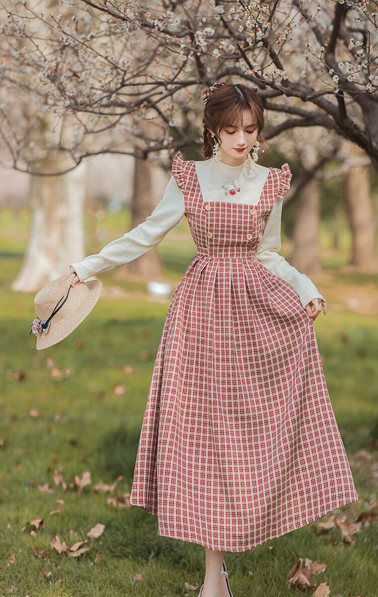 送料無料୨♥୧ オータムウィンターレディースドレス パッチワークニット レッド格子柄フローラル刺繍ヴィンテージミディ 大人ガーリー スウィート キュート カジュアル 秋物 冬物 花柄 ビンテージ AOS22875390302