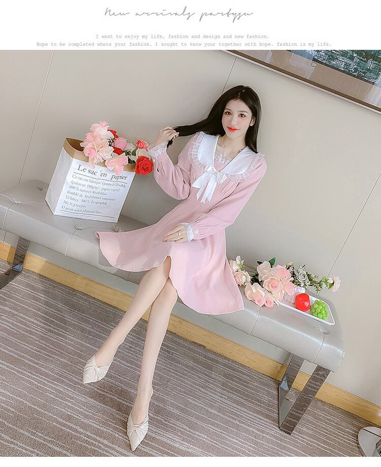 送料無料୨♥୧ オータムスプリングレディースドレス カラーレースフリルリボンAライン ピンク ラッフル 大人ガーリー スウィート キュート カジュアル 春物 秋物 AOS8187146172