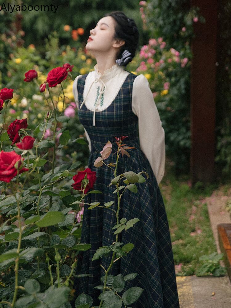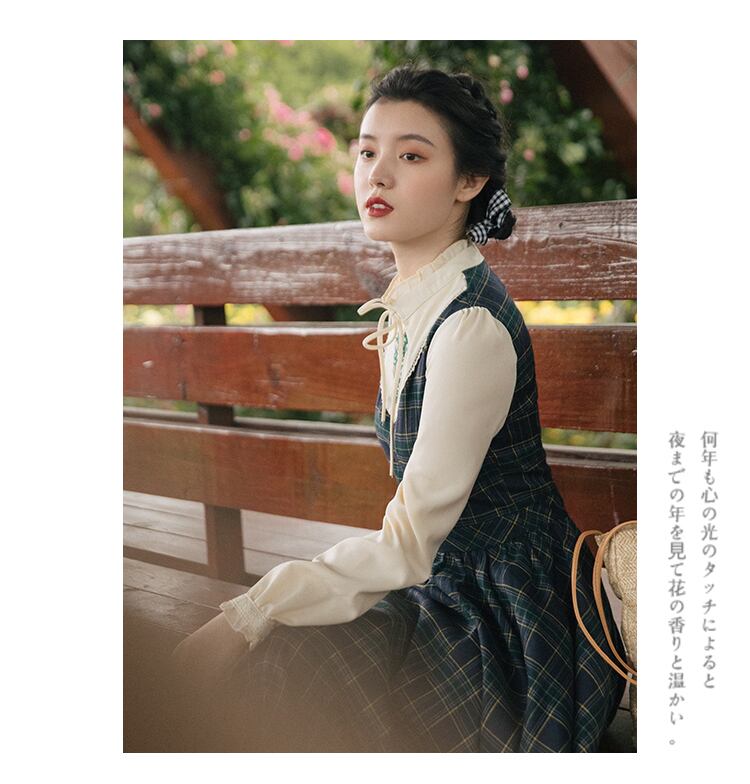 送料無料୨♥୧ オータムウィンターレディースマキシドレス スタンドカラーカラーパッチワークグリーン格子柄フローラル刺繍ヴィンテージドレス ワンピース 大人ガーリー スウィート キュート カジュアル 秋物 冬物 花柄 ビンテージ AOS18597745021