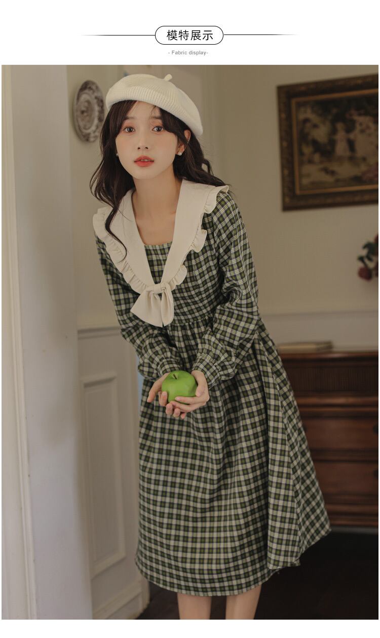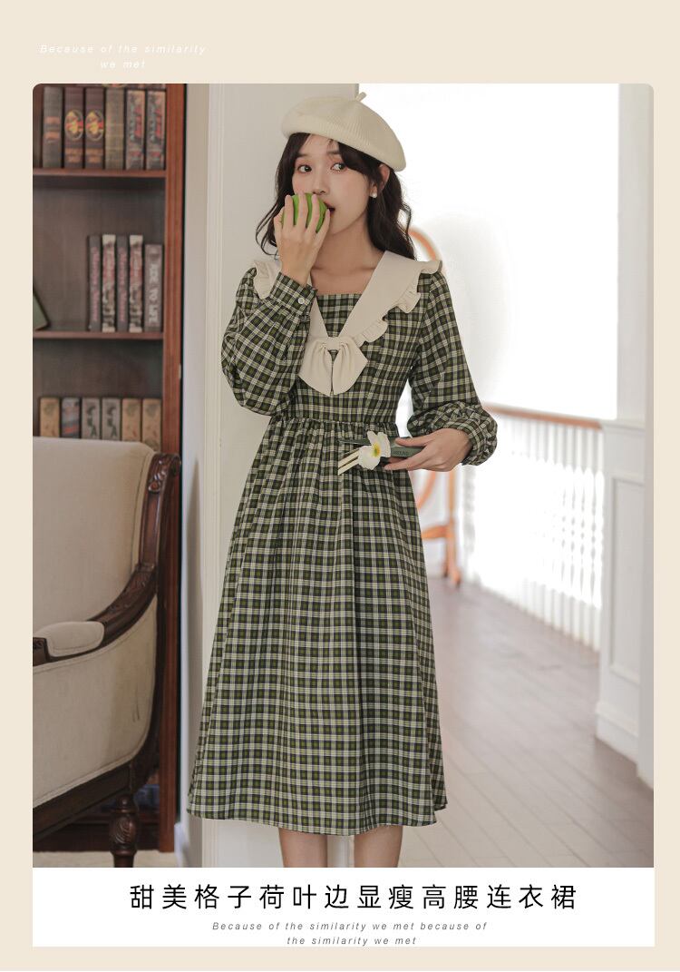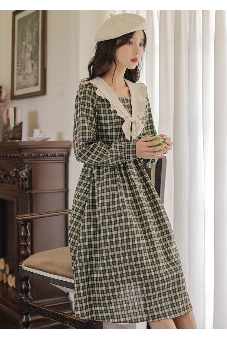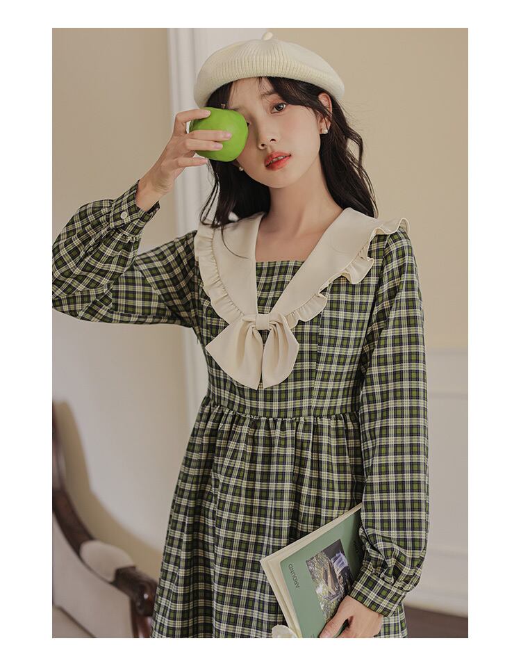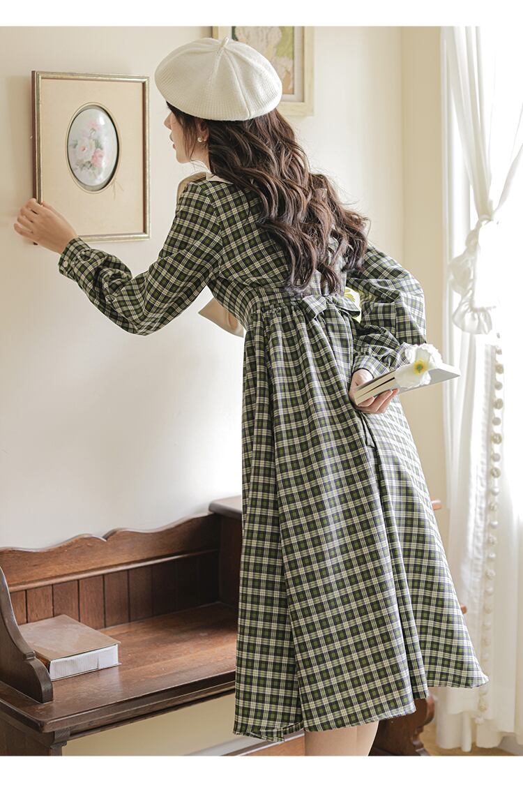 送料無料୨♥୧ オータムウィンターレディースグリーンドレス カラーリボン格子柄ヴィンテージスタイルミディ 大人ガーリー スウィート キュート カジュアル 秋物 冬物 ビンテージ AOS64491712635