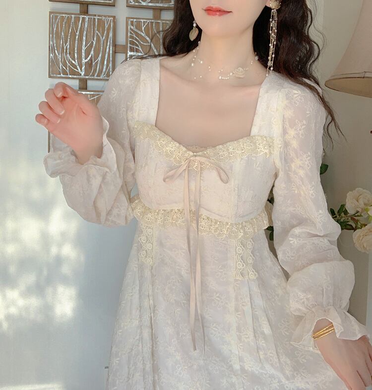送料無料୨♥୧ スプリングオータムレディースドレス カラーレースフリルドレス ワンピース ラッフル 大人ガーリー スウィート キュート カジュアル 春物 秋物 スクウェア AOS20114954341