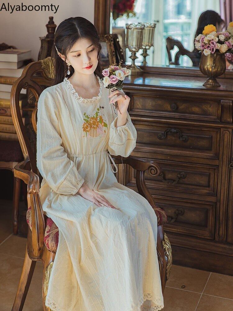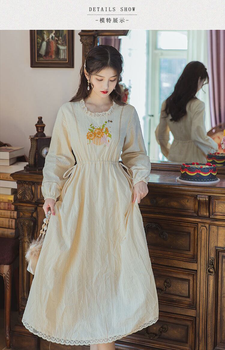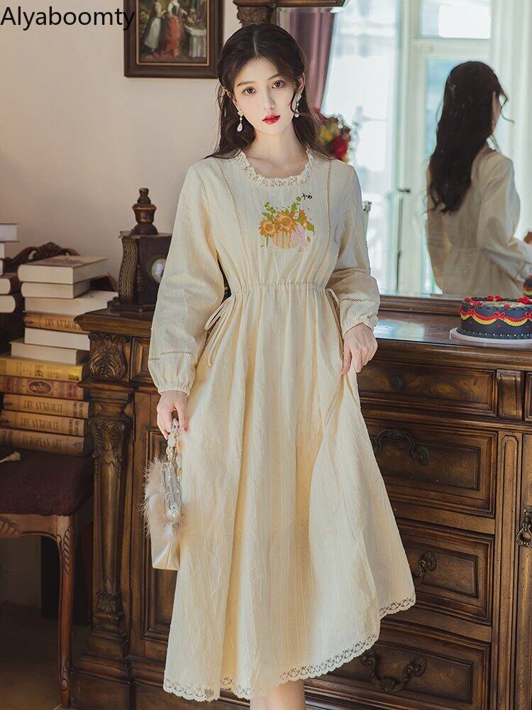 送料無料୨♥୧ スプリングオータムレディースヴィンテージドレス レースミディ刺繍スタンダード コットン レトロ 大人ガーリー スウィート キュート カジュアル 春物 秋物 Oネック フラワーデザイン ビンテージ AOS53966962877