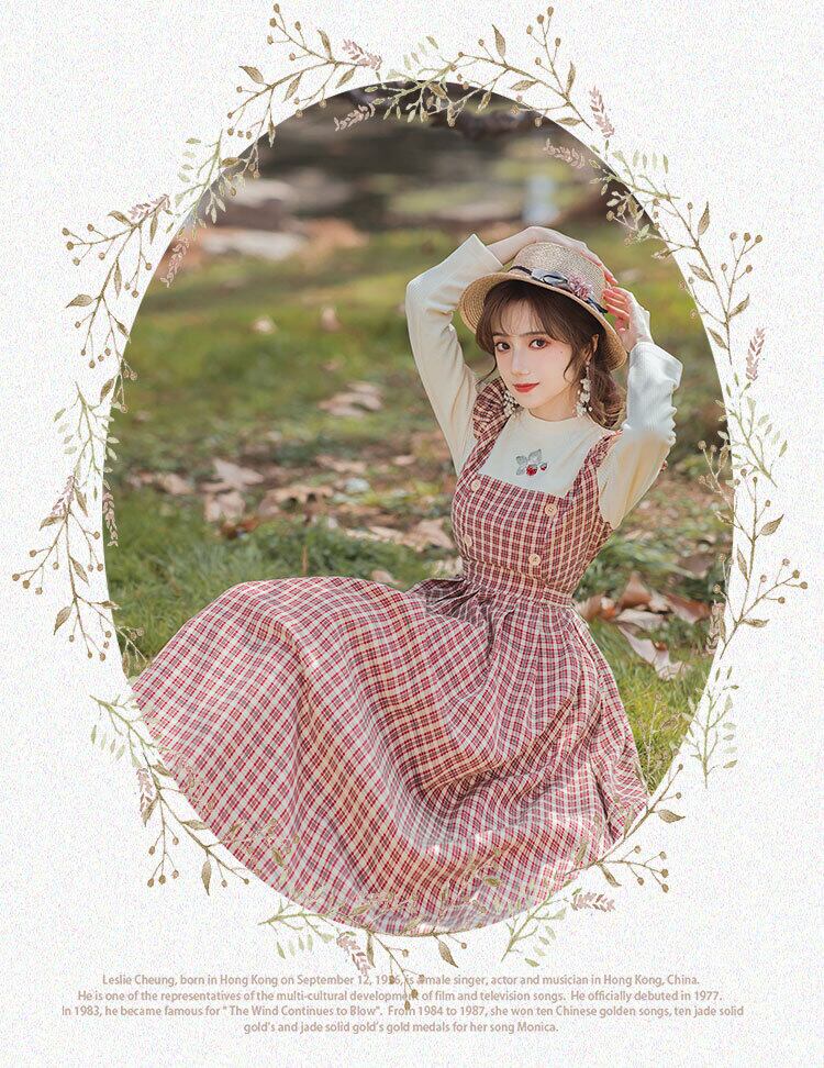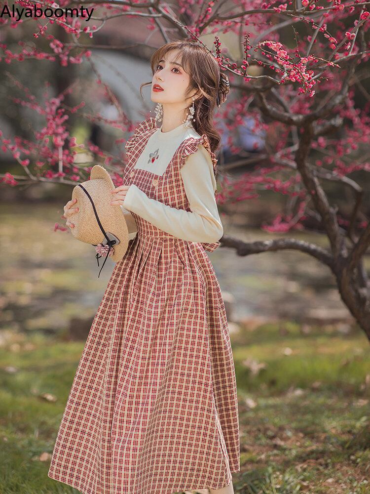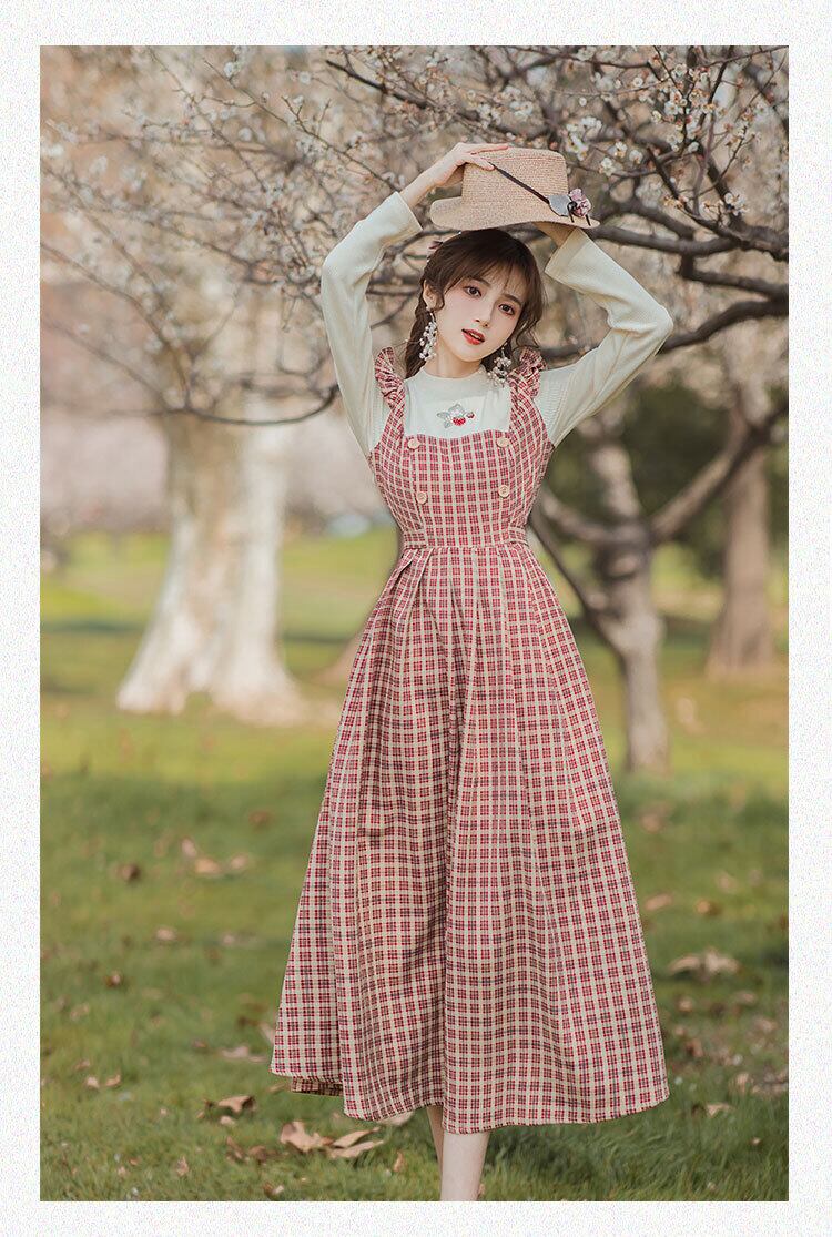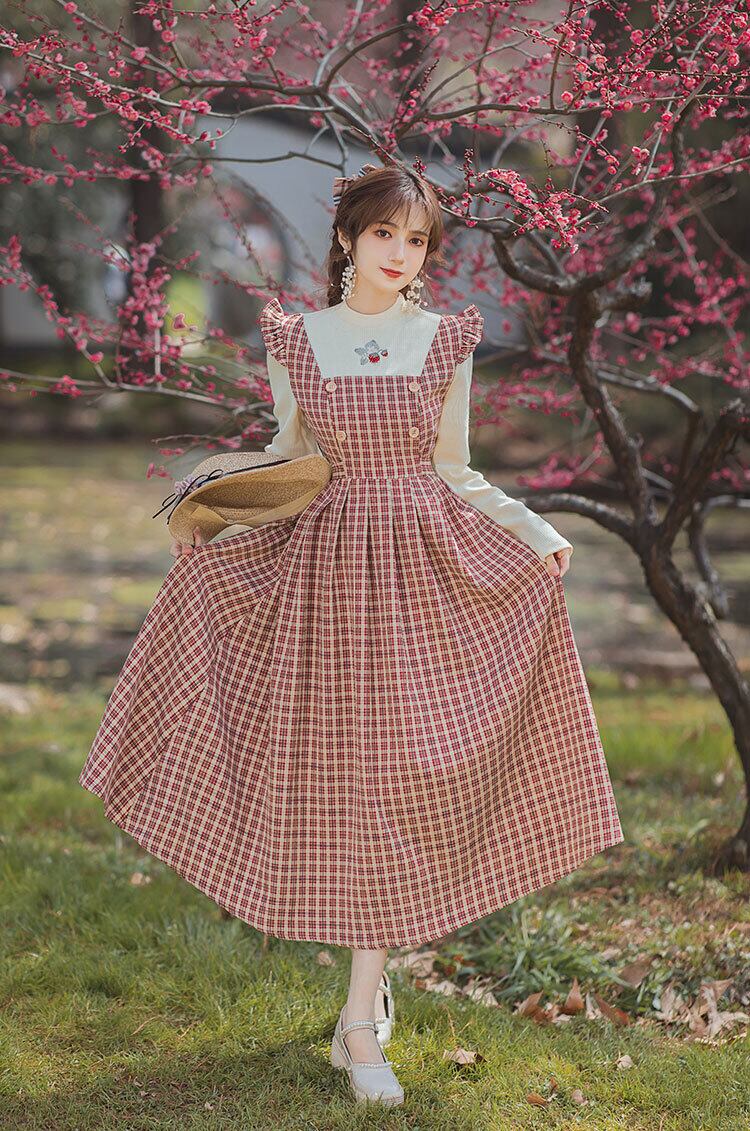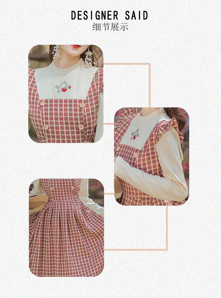 送料無料୨♥୧ オータムウィンターレディースドレス パッチワークニット レッド格子柄フローラル刺繍ヴィンテージミディ 大人ガーリー スウィート キュート カジュアル 秋物 冬物 花柄 ビンテージ AOS33499342709