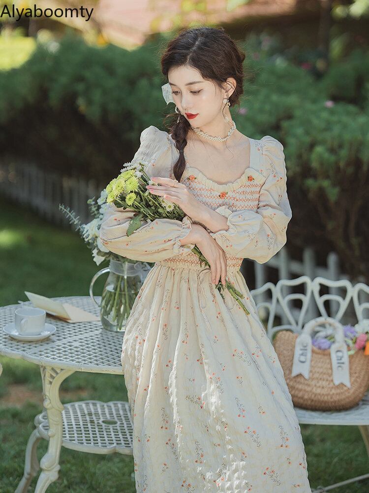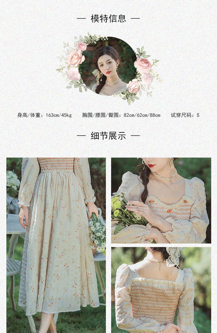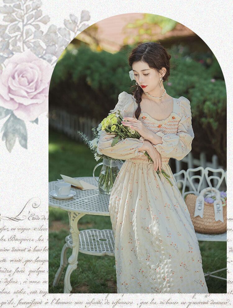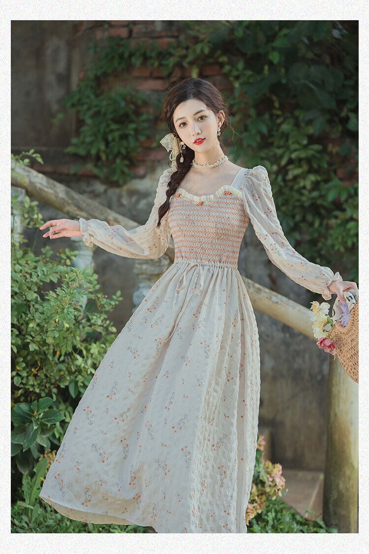 送料無料୨♥୧ スプリングオータムレディースドレス カラーフローラルロングヴィンテージ 大人ガーリー スウィート キュート カジュアル 春物 秋物 花柄 スクウェア ビンテージ AOS21828613122