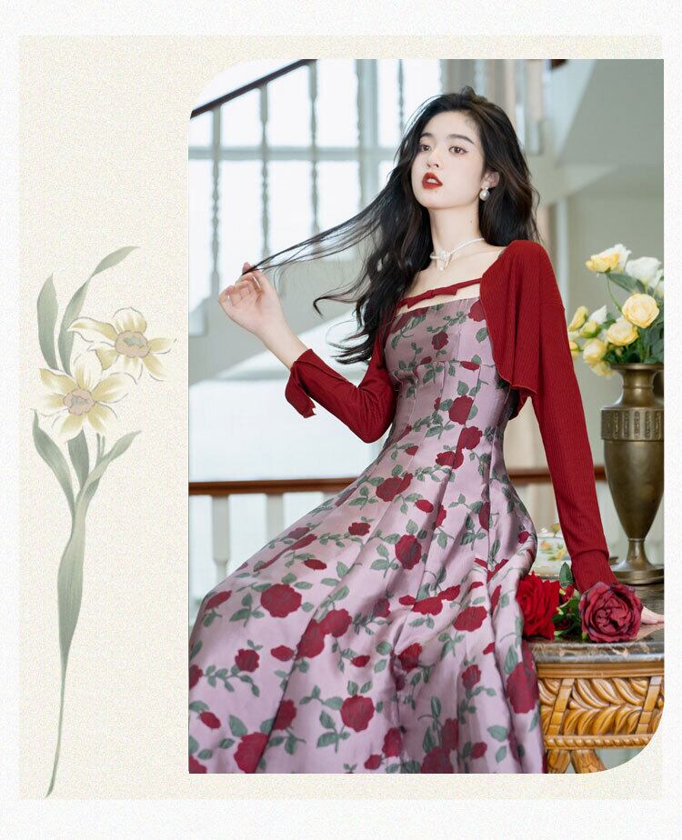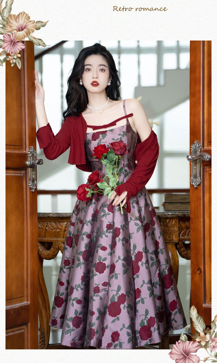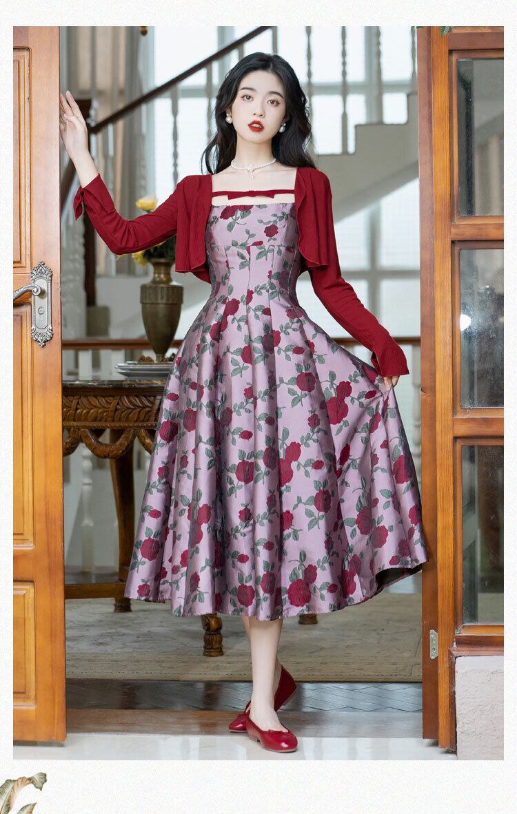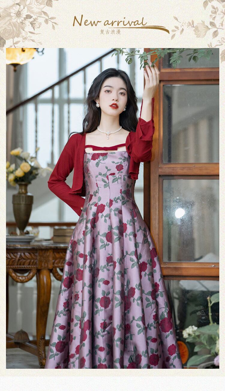 送料無料୨♥୧ サマーオータムレディースドレス フローラルジャカードレッドカーディガン ショート 夏物 秋物 花柄 パープル AOS74423491172
