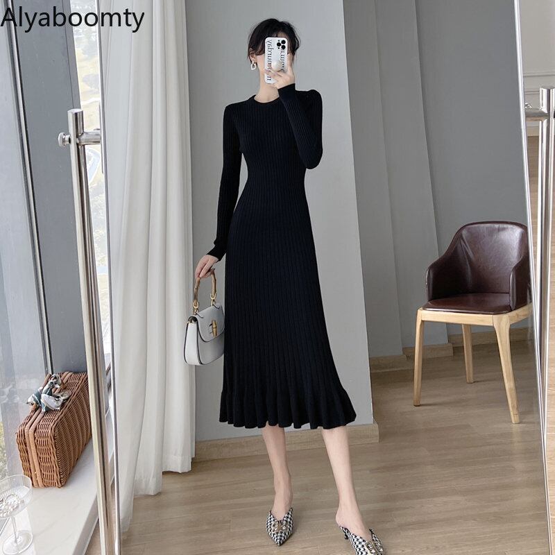 送料無料୨♥୧ スタイルオータムウィンターレディースロングセーター ドレス ブラックニット フリル ピンク ラッフル 秋物 冬物 AOS9653116407